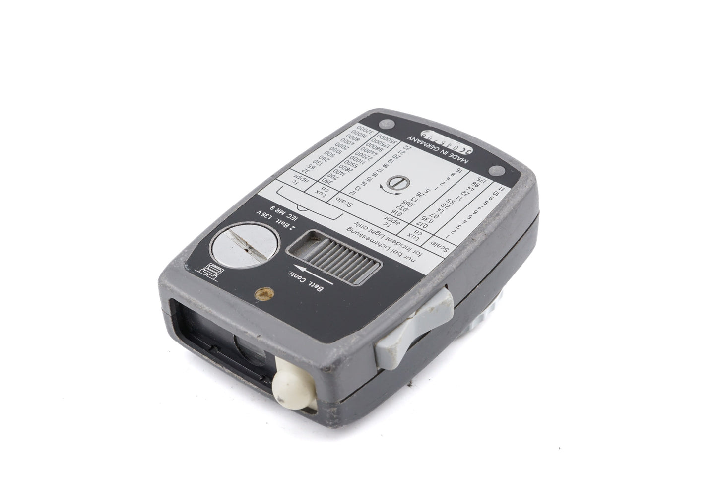 Handheld exposure meter made by Gossen introduced in 1966. Features a sliding incident dome. Plastic body available in grey.