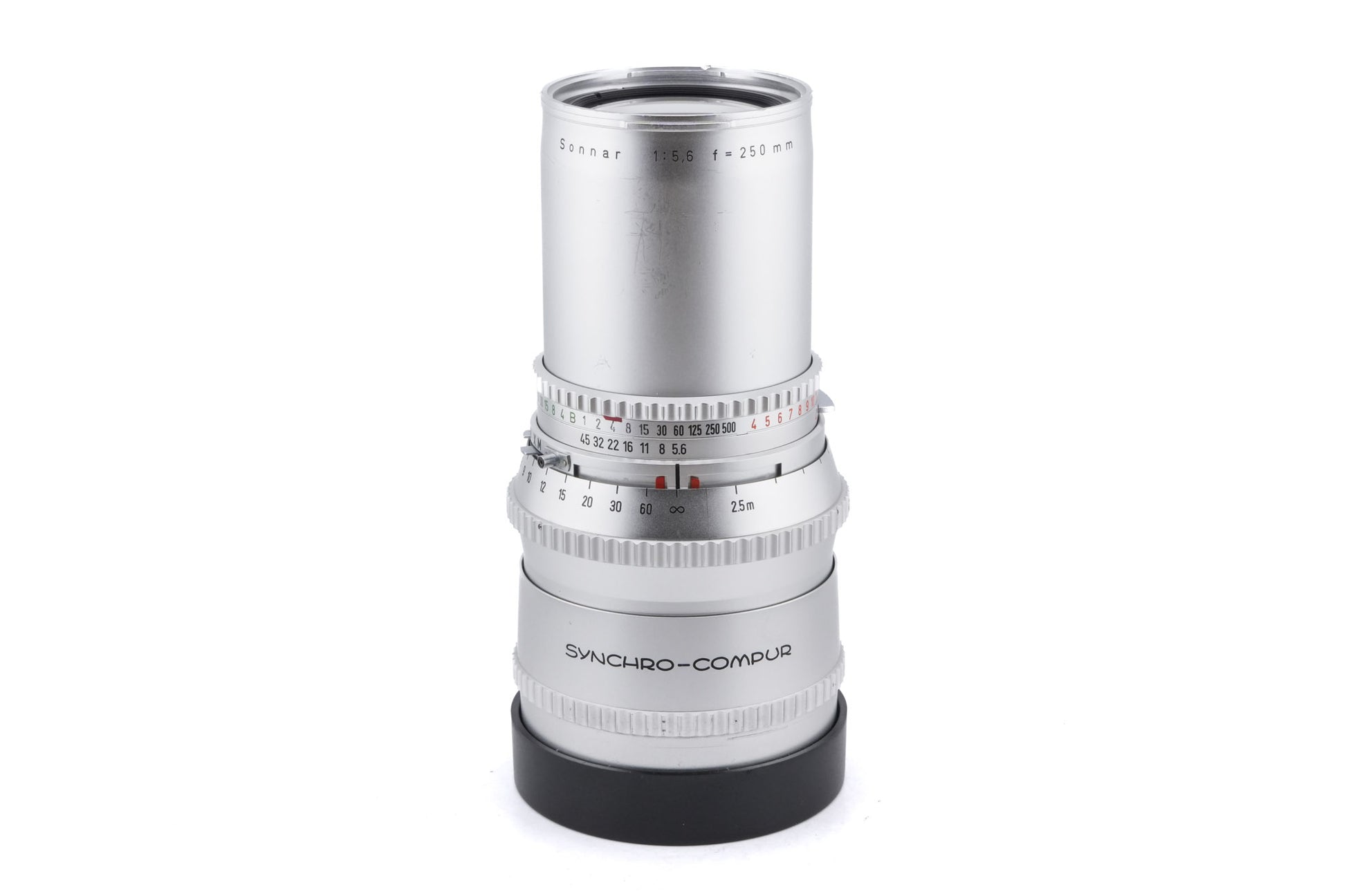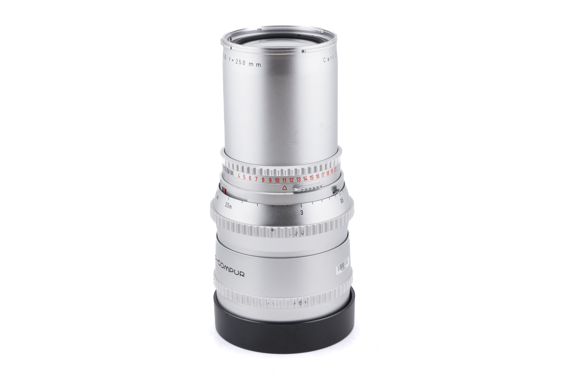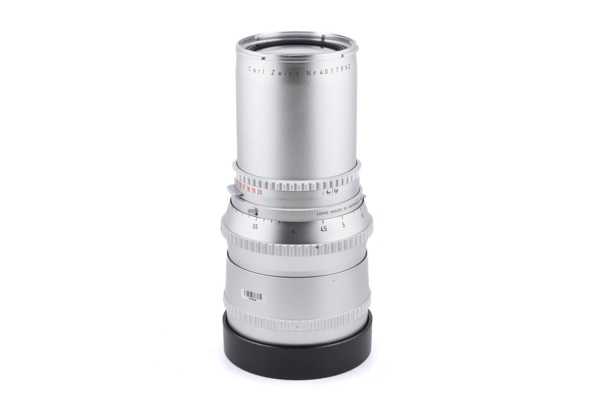 Manual focus telephoto lens made for Hasselblad V system medium format SLR cameras by Carl Zeiss starting in 1957. The 250mm was one of the original lenses made for the 500C. Early versions do not have a depth-of-field preview button. The lens is sharpest wide open at f5.6. Metal body available in silver and black.