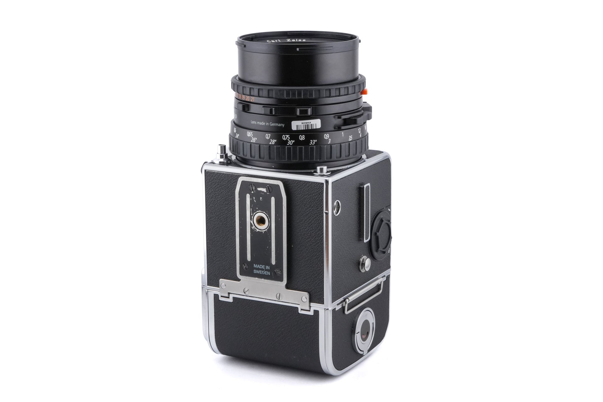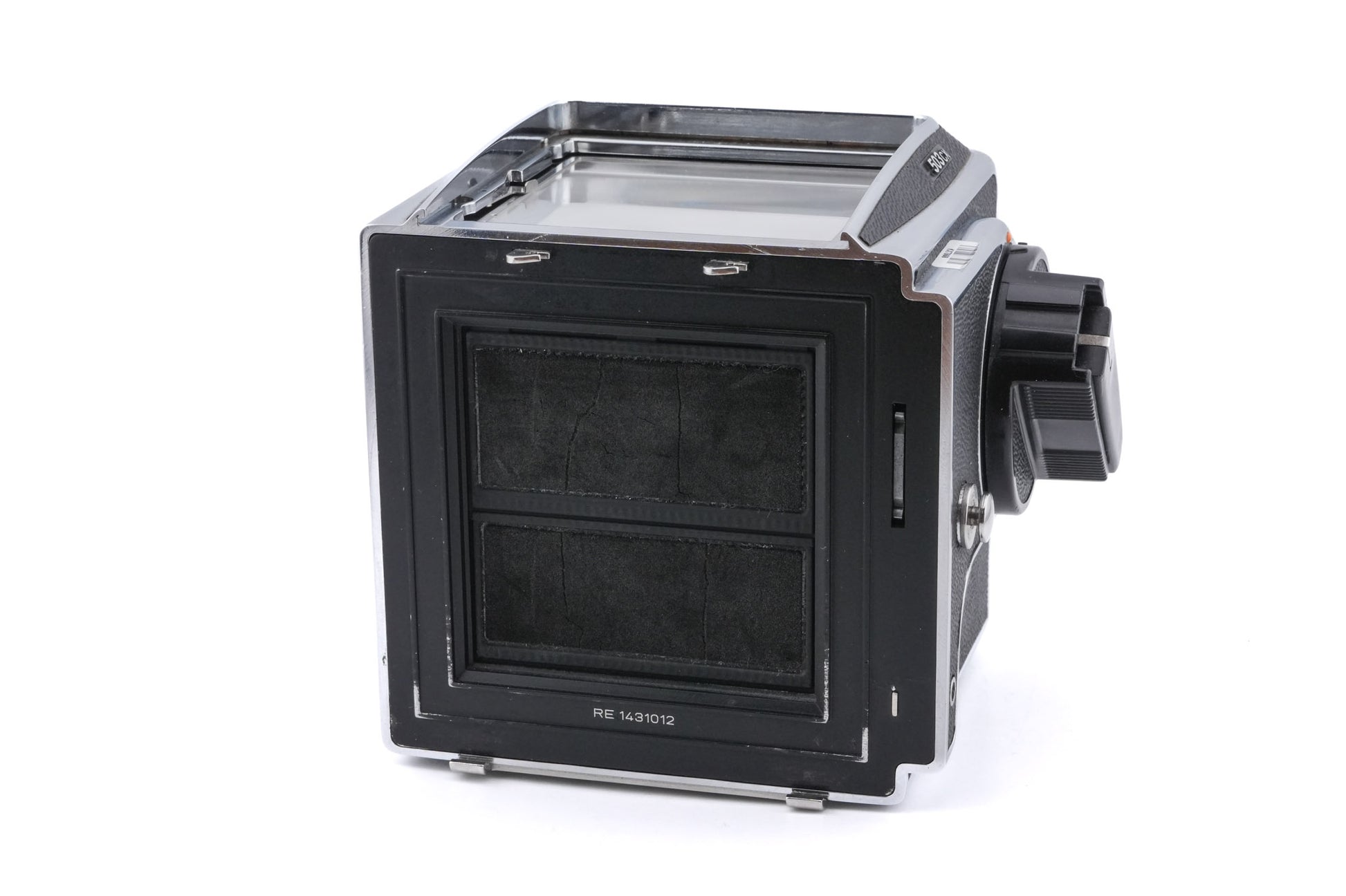 Manual focus 6x6 120 medium format modular V-mount SLR camera introduced by Hasselblad in 1989. It added off the film (OTF) metering, flash control, and a much brighter Acute-Matte focusing screen to the already-popular 500C/M body. It is a fully modular camera, with interchangeable lenses, prisms, grips, winders, focusing screens, and film backs. There was a model made for the Japanese market. It has a small star on the nameplate. Metal body available in silver (10026).