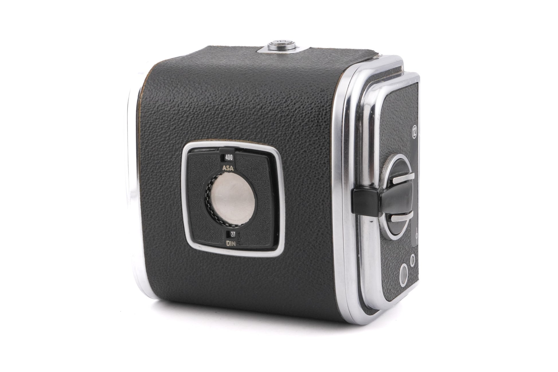 120 film magazine released for V system 120 SLRs by Hasselblad in 1968. This design improved over the previous C12 magazine by adding a winding crank to improve loading speed and an automatic system for stopping at the first frame. The back window was also removed. Exposes 12 6x6 frames on one roll of 120 film. Originally chrome, but became available in black in 1973.