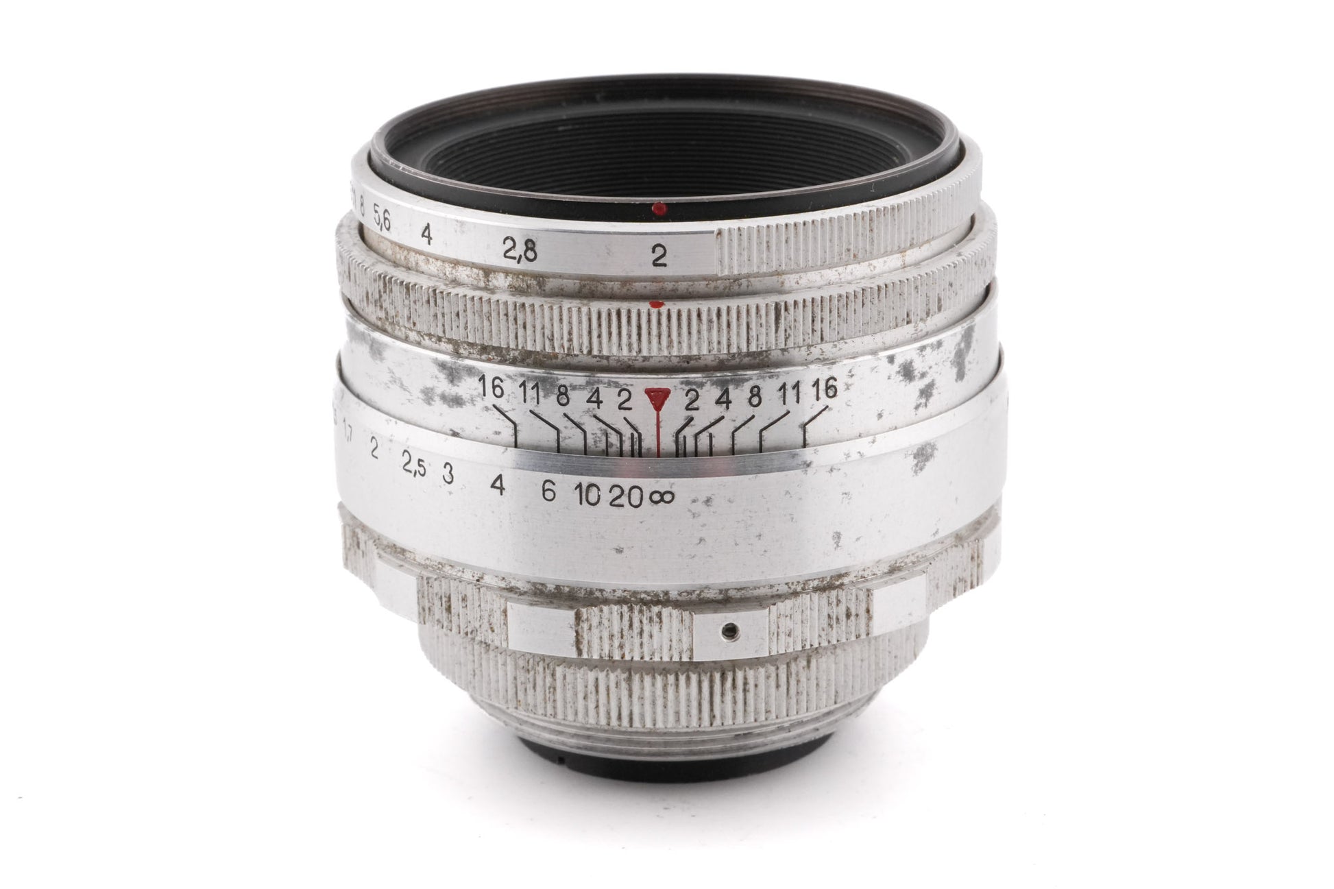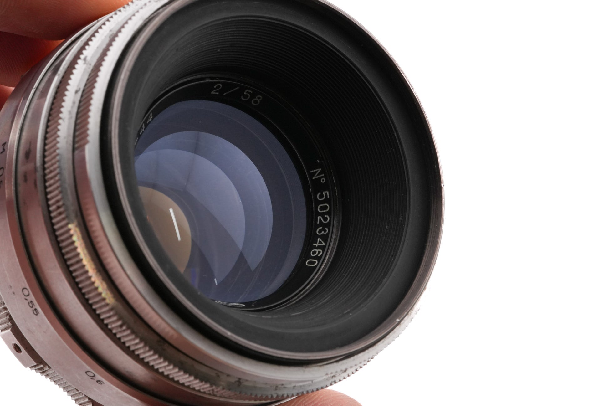 Manual focus normal lens made for M39 mount SLR cameras in the Soviet Union. It's a copy of the Carl Zeiss Jena 58mm f2 Biotar lens design. Metal body available in black and silver.