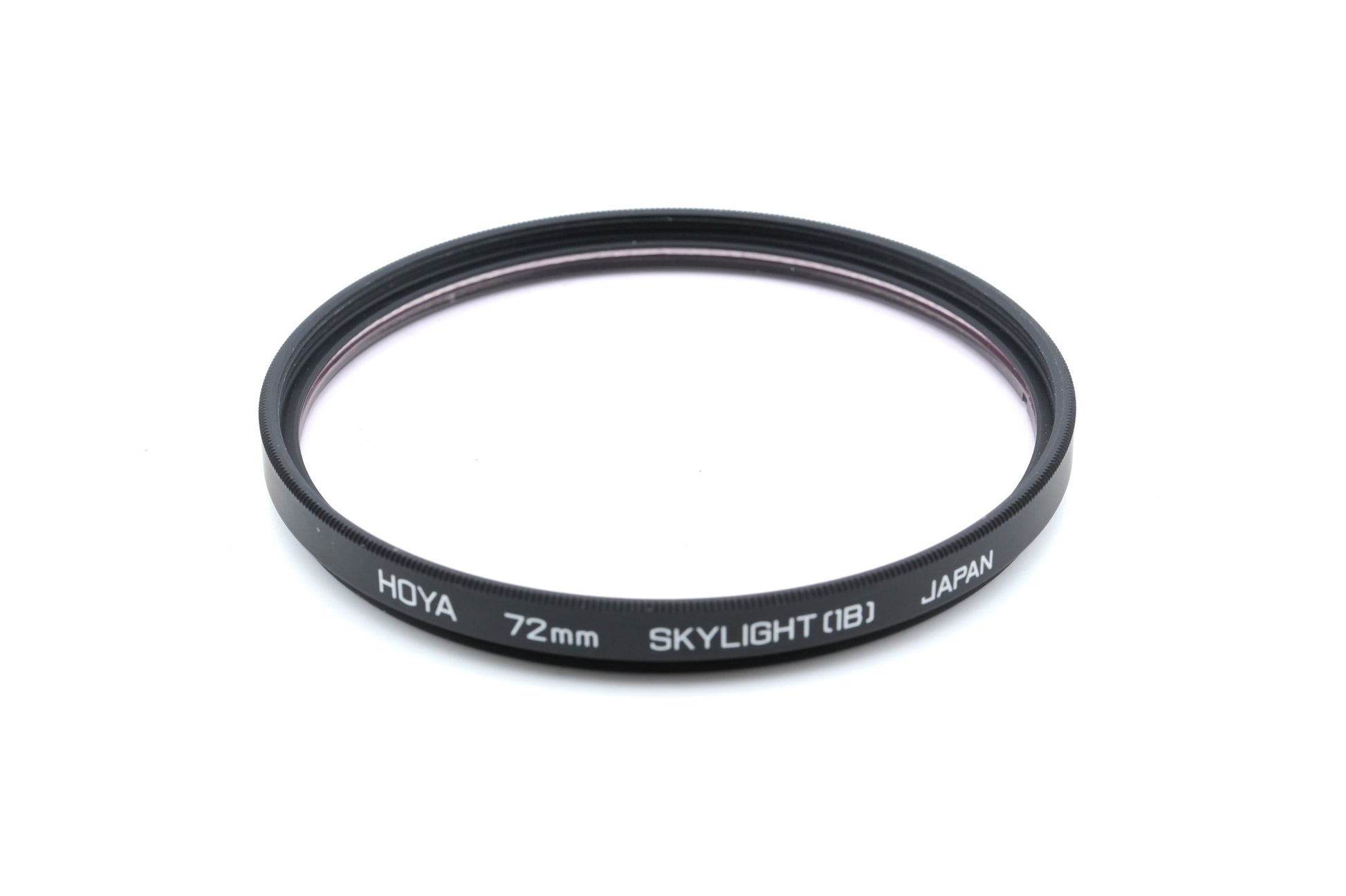 Skylight (light warming) filter made by Hoya for all lenses with 72mm filter threads. Slightly stronger coloring effect than 1A filters, with a light pink/magenta color cast. Black metal construction with knurled edges.
