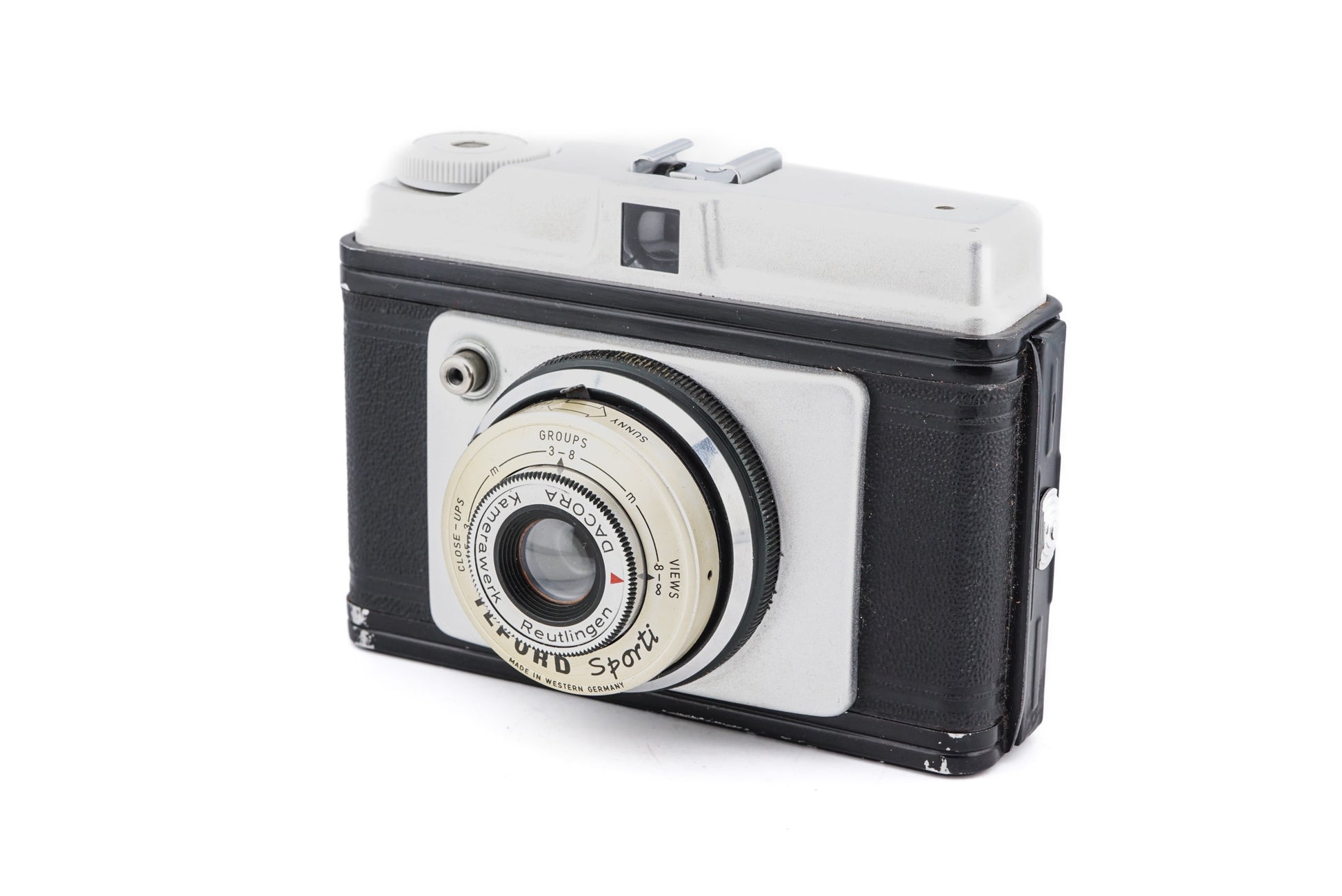 Manual focus 120 viewfinder camera released by Ilford in 1959. The cameras were produced by Dacora and based heavily on the Digna series of cameras. Metal/plastic body available in black/silver.
