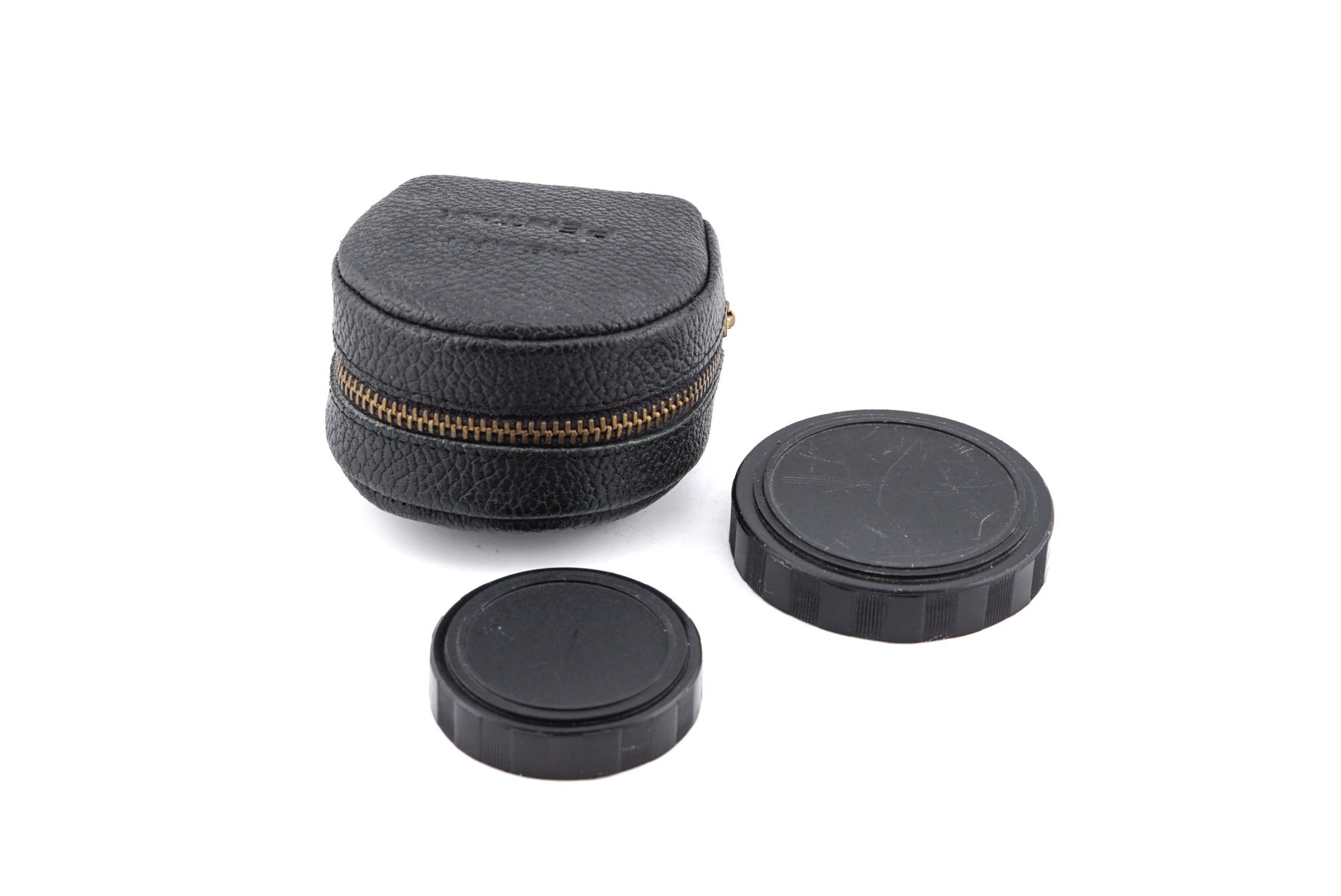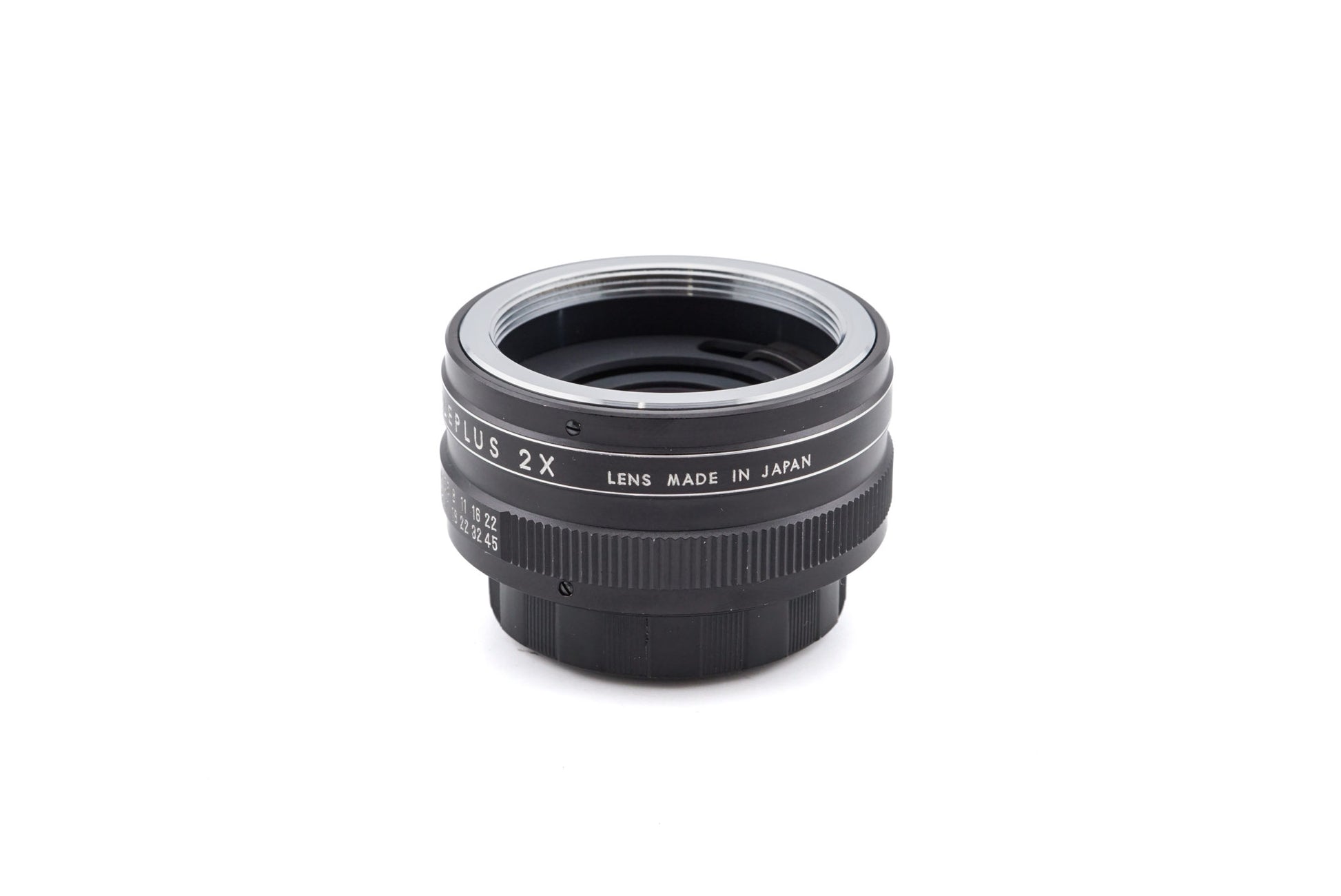 2x teleconverter made by Kenko for M42-mount 35mm cameras. Doubles the focal length of the lens at the cost of halving the amount of light. Black metal body.