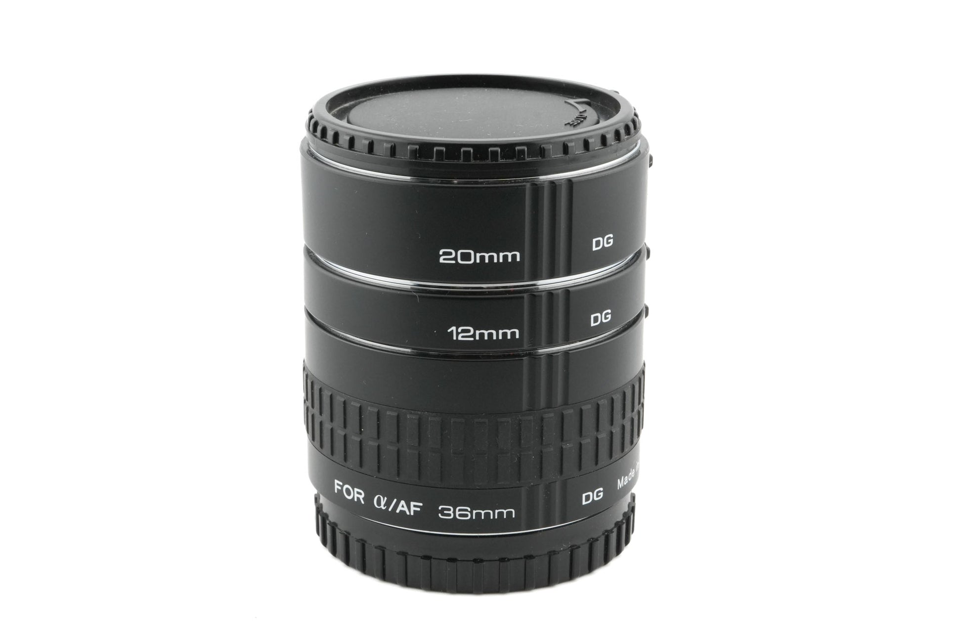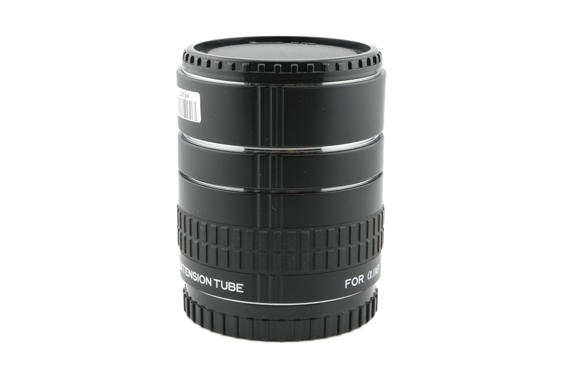 AF extension tubes made by Kenko for Sony A-mount lenses. 12mm, 20mm, and 36mm tubes, which can be used in any combination or individually. Metal and plastic body available in black.