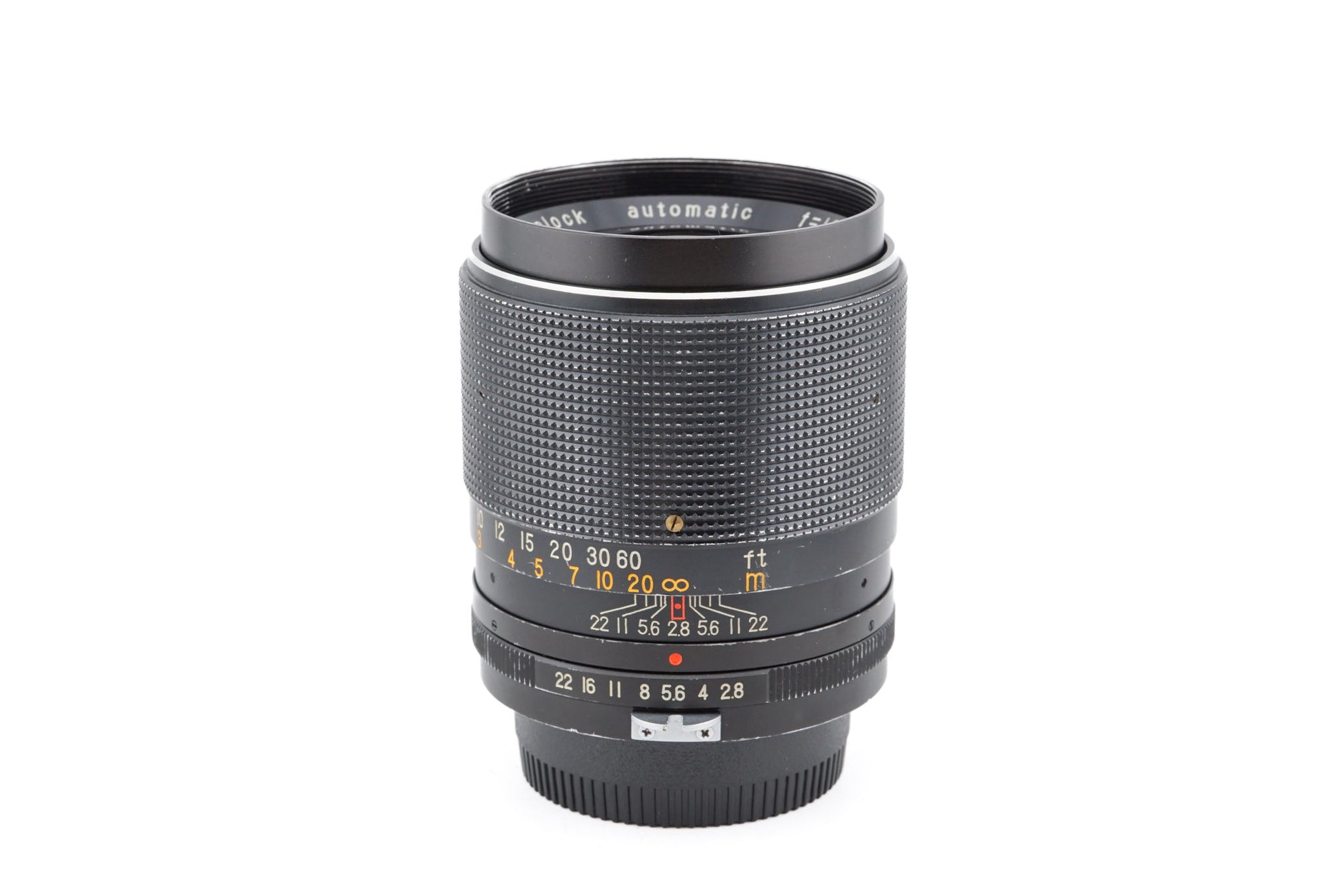 Manual focus telephoto lens made for F-mount 35mm SLR cameras by Kenlock. Most likely a rebranded lens made by another brand and sold with many different lens mounts. Metal body available in black.