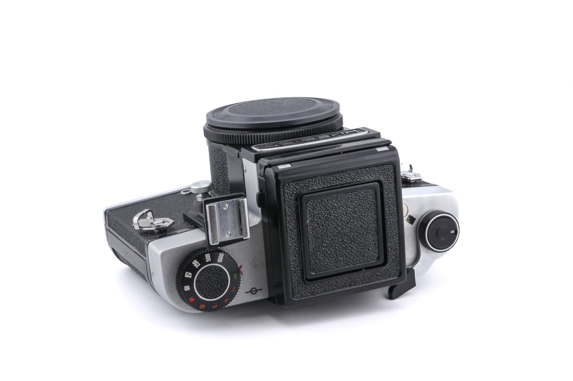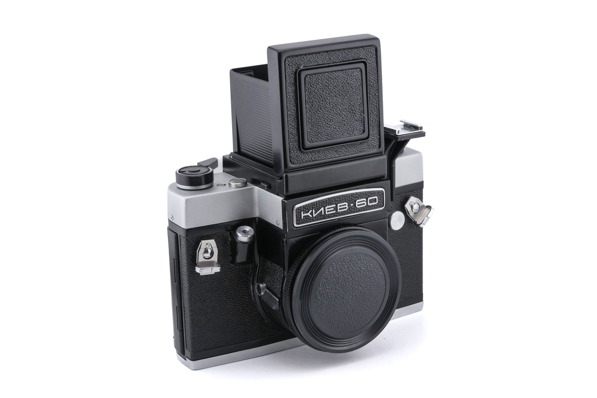 Manual focus Pentacon Six mount 120 6x6 medium format SLR camera made by Kiev from 1984 to 1999. Metal body available in silver or black.