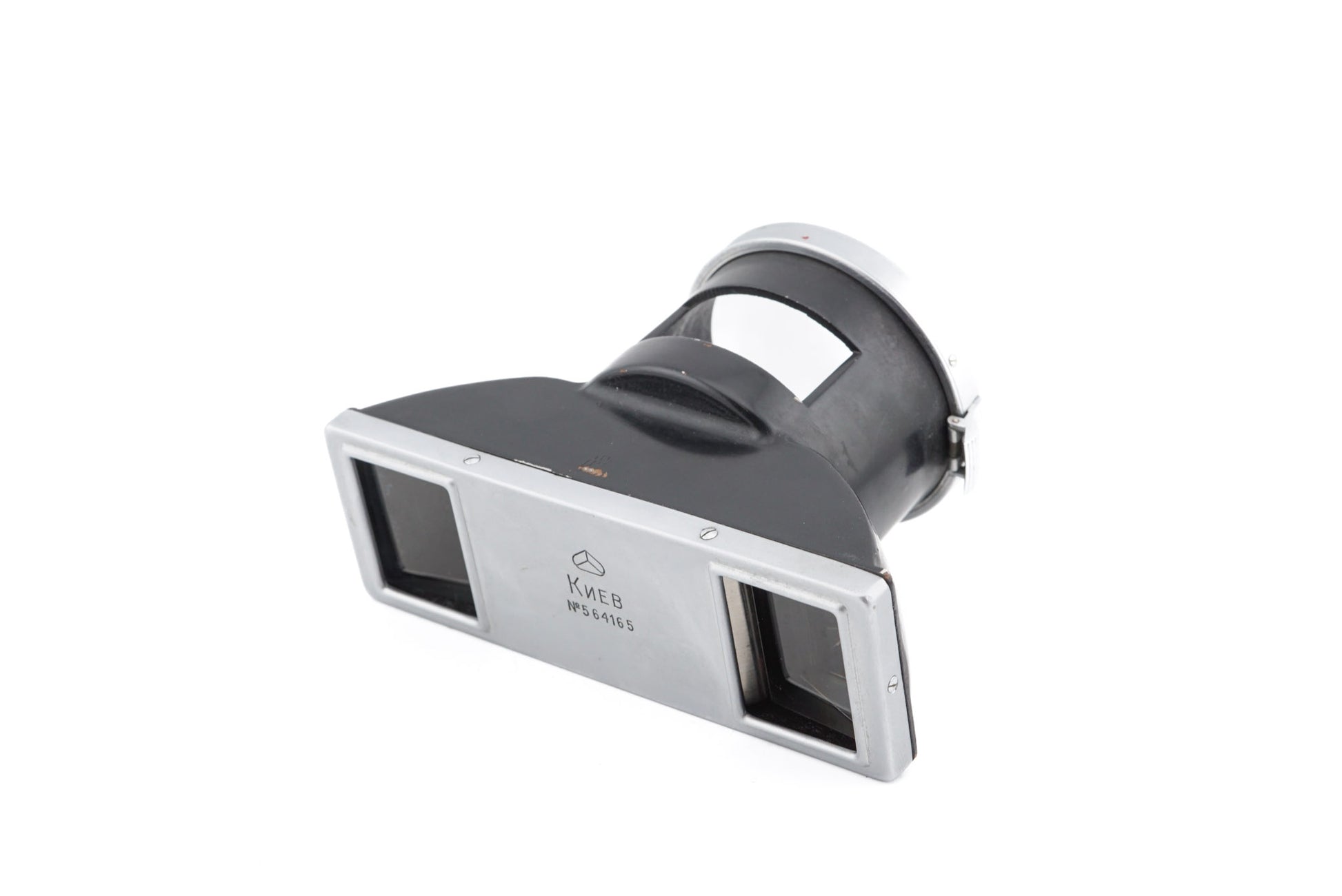 Stereoscopic attachment made for the Kiev/Contax mount cameras by Kiev. Attaches over the lens on the outer bayonet of the cameras. Metal body available in black/silver.