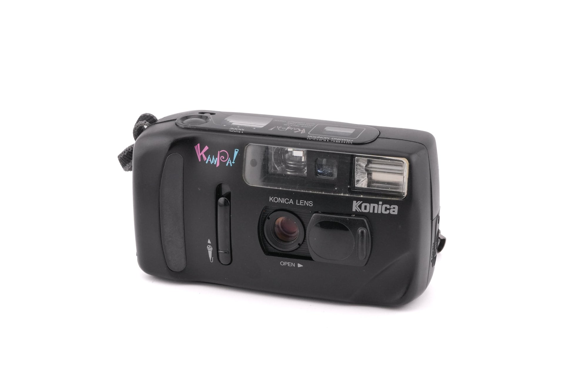 Fixed focus 35mm point-and-shoot camera introduced by Konica in 1989. It was marketed as a party camera with "Kanpa!" meaning "cheers" in Japanese. It has a built-in microphone that triggers the shutter upon loud noises. It was released together with a tripod that allowed it to turn towards the sound and try to capture the scene. Plastic body available in black.