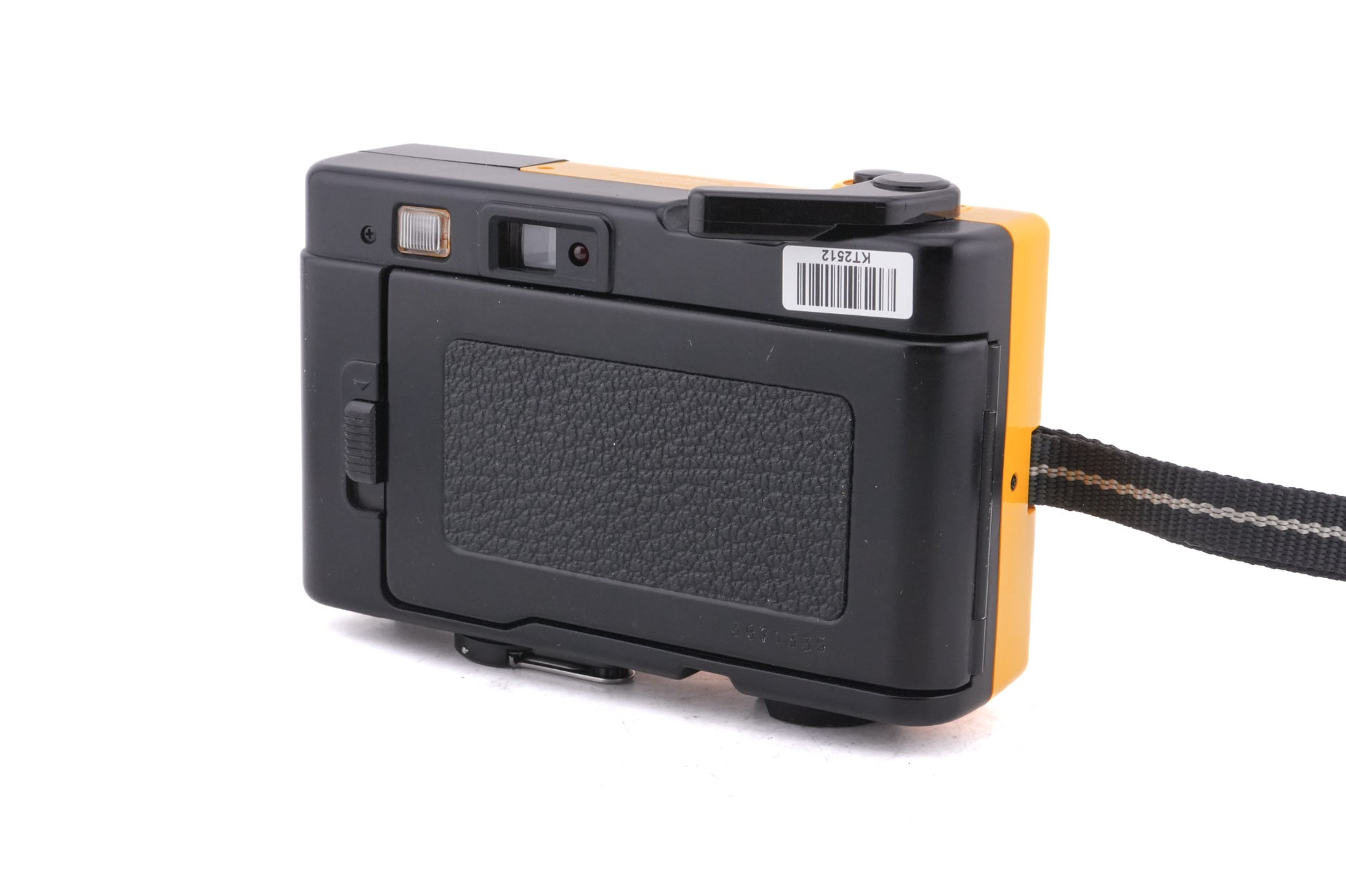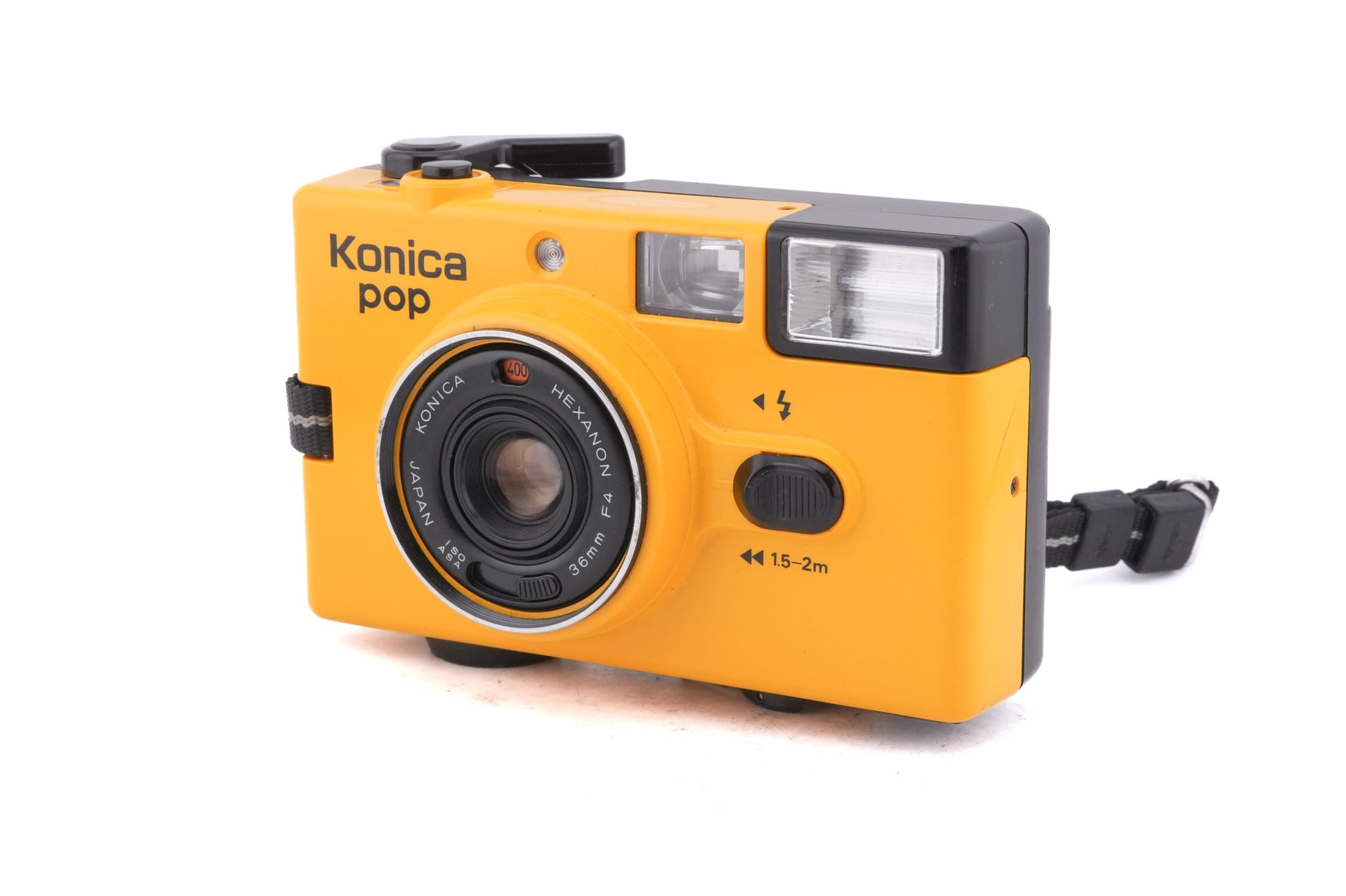 Fixed focus 35mm point-and-shoot camera released by Konica in the 1980s. The name comes from the camera's pop-up flash. Versions with "ISO ASA" text on the ISO selector (visible when set to 100) have values of 100 and 400 to select from, while the versions without that text have 100, 200, and 400 to select from. This has a very minor effect on use, as color film can safely be shot at one stop over or under without any noticeable difference. Plastic body available in black, red, yellow, green, silver, and more colors!