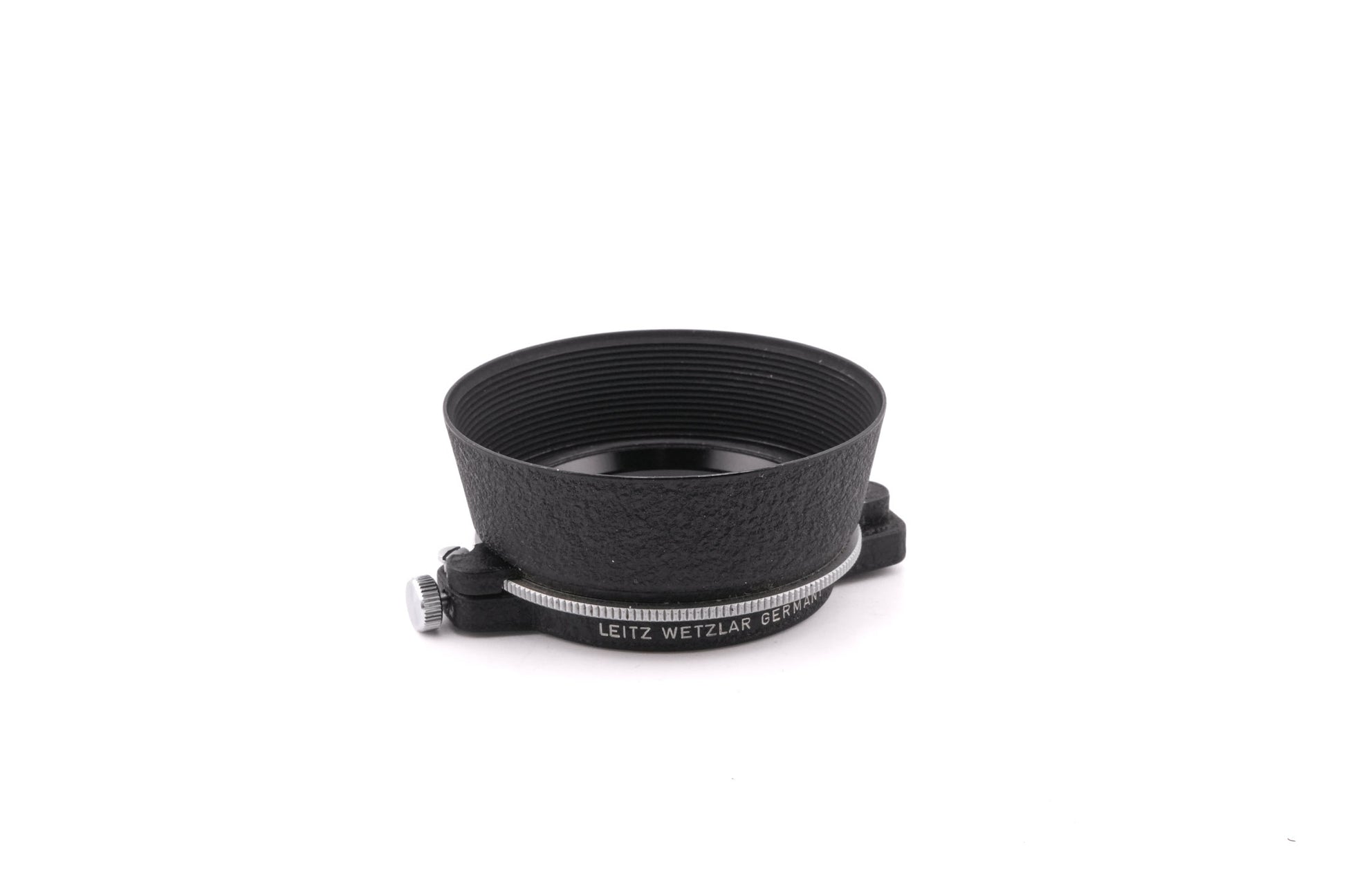 Rotating lens hood/polarizing filter combo made by Leica. It attaches via a clamping ring and a tightening screw. It swings out from its mount, so that it can be put aside while still being attached to the lens. Metal body available in black.
