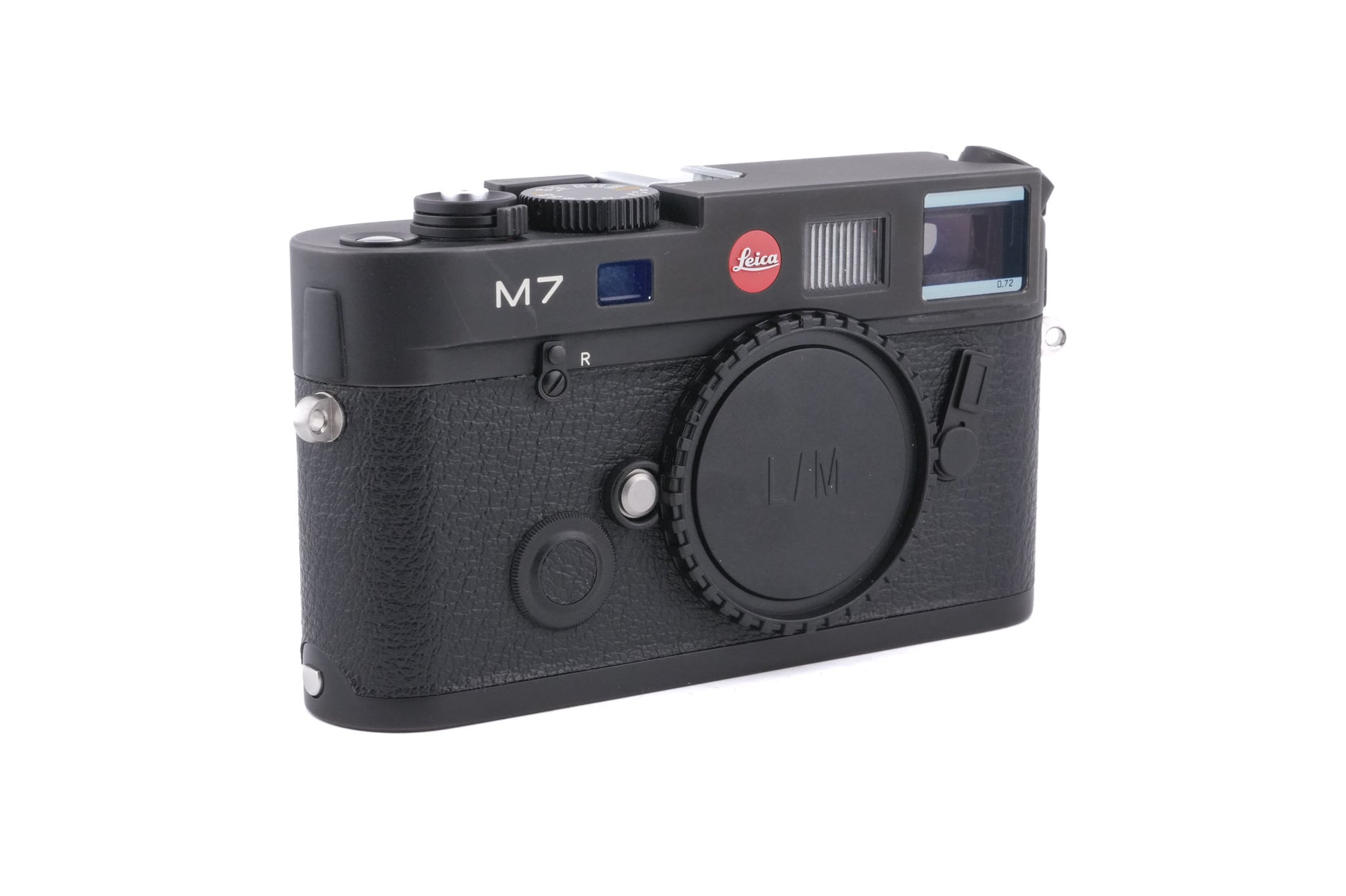 Manual focus M-mount 35mm rangefinder camera introduced by Leica in 2002. The M7 is similar to the M6 in appearance, but it added an electronic shutter control with automatic aperture priority. It has a circuit breaker switch around the shutter release button that also acts as a safety catch for the button itself. It was available in three configurations: a 0.72x viewfinder (framelines for 28/90mm, 35/135mm, and 50/75mm), a 0.58x viewfinder (framelines for 28/90mm, 35mm, and 50/75mm), and a 0.85x viewfinder (framelines for 35/135mm, 50/75mm, and 90mm). The 0.72x was available in black and silver, while the 0.58x and 0.85x were available in black only. The camera uses two CR1/3N lithium batteries. Metal body available in black (10503).