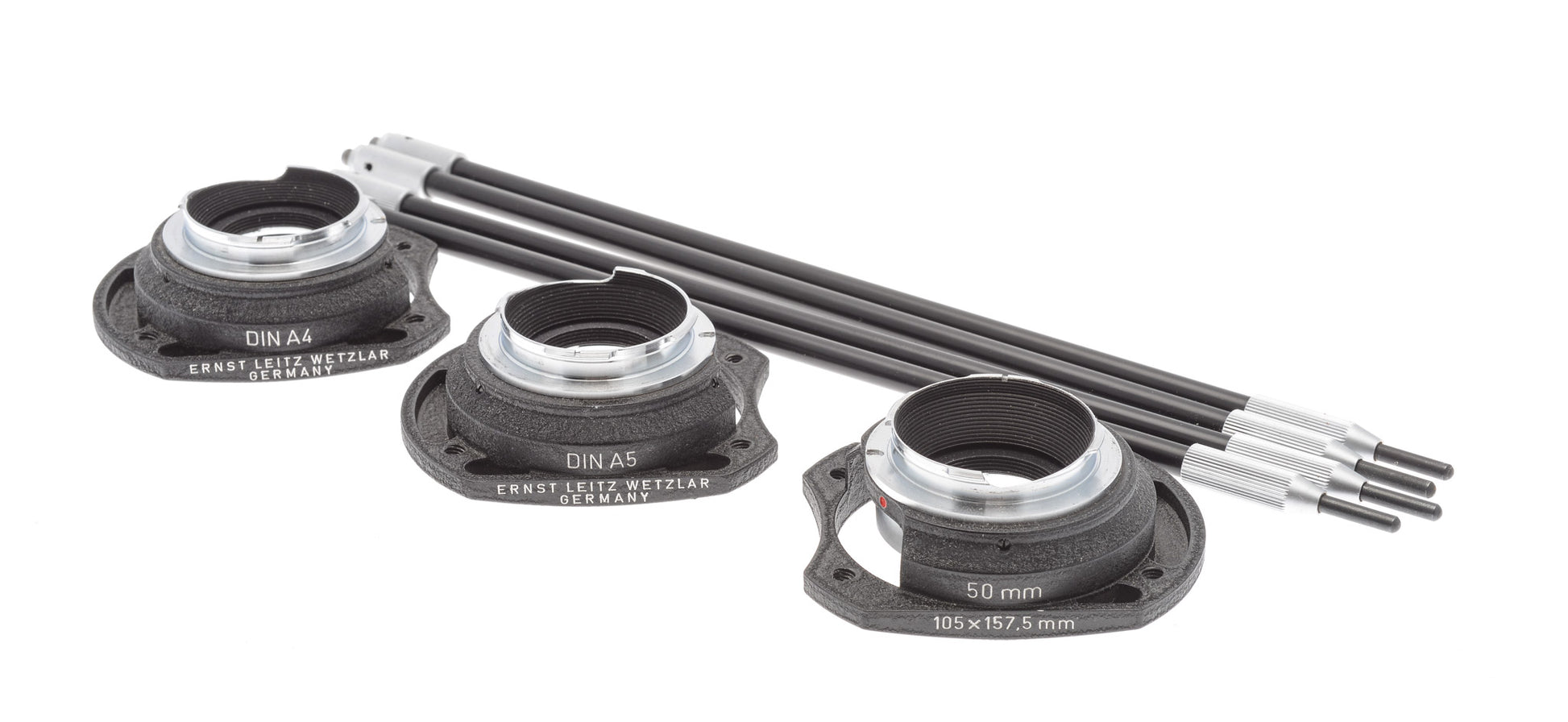 Copy stand made by Leica for Leica M lenses of focal length 5 cm. Black and silver metal body.