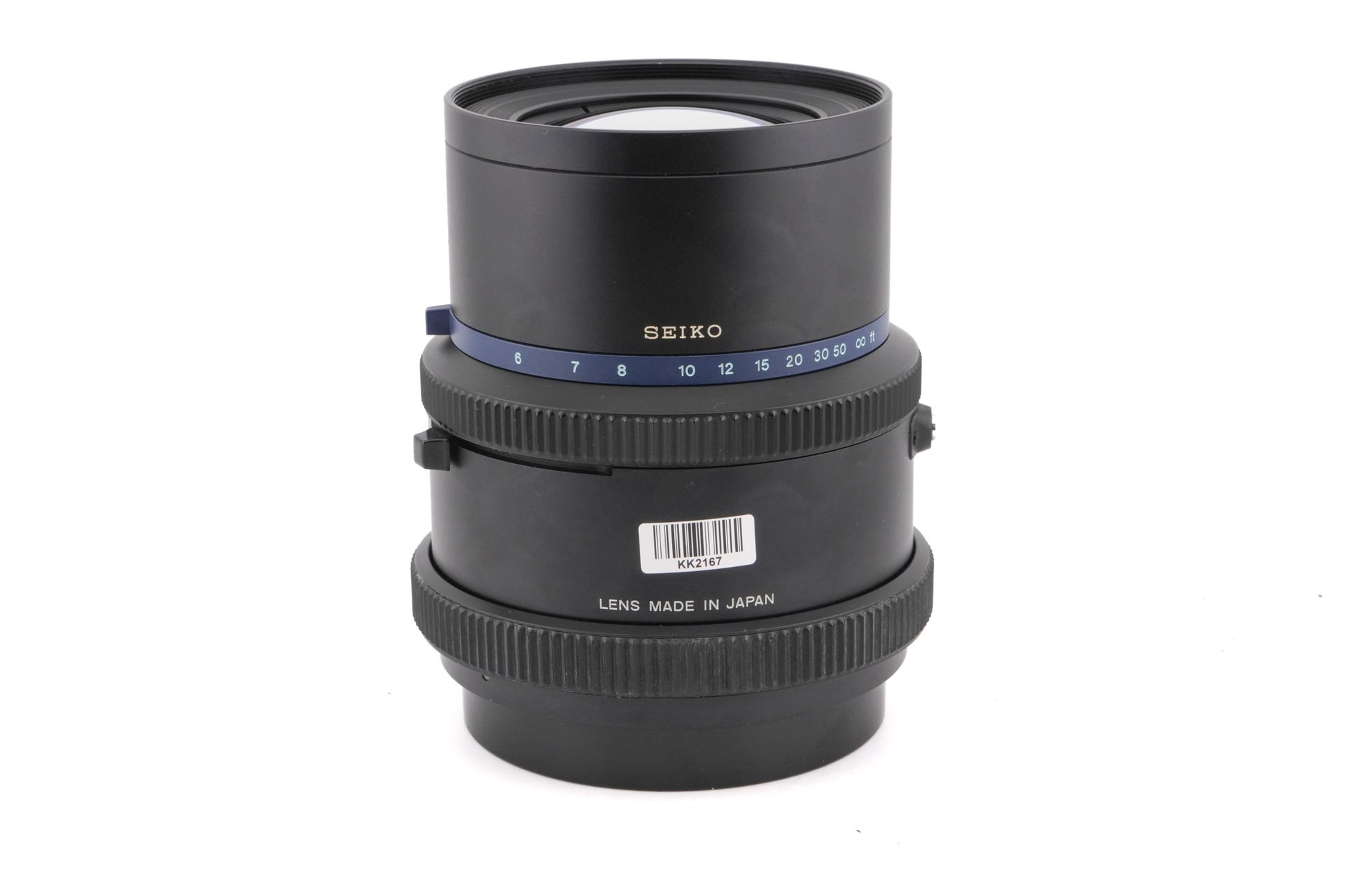Manual focus telephoto lens made for Mamiya RZ67 120 SLR cameras by Mamiya. It gives an equivalent focal length of 90mm on 35mm / Full Frame. It has a built-in leaf shutter like all Mamiya RZ67 lenses. Metal body available in black.
