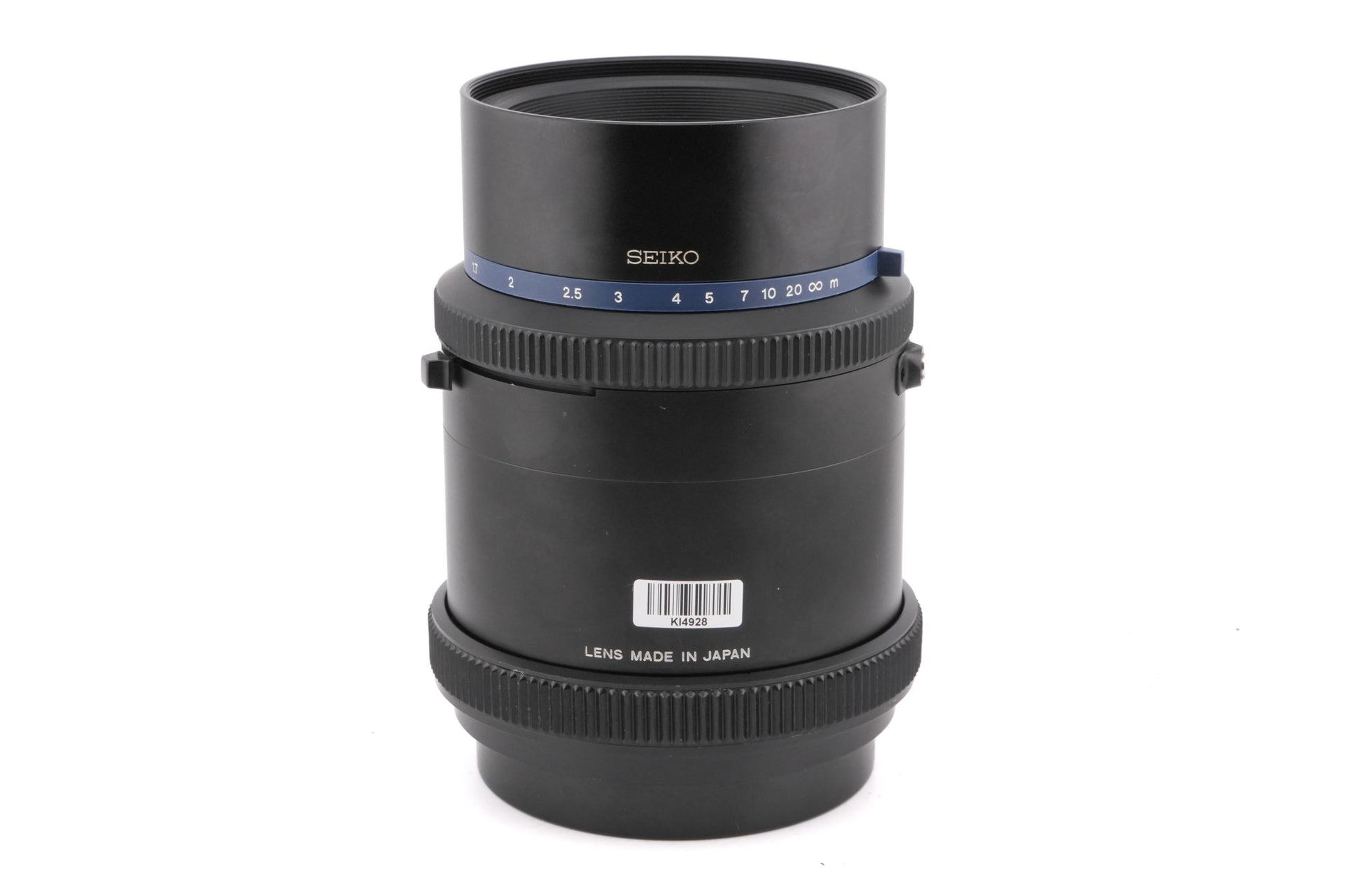 Manual focus telephoto lens made for the Mamiya RZ67 system, introduced by Mamiya. Simple Tessar-type optical design. Built-in Seiko #1 shutter. Metal body available in black finish.