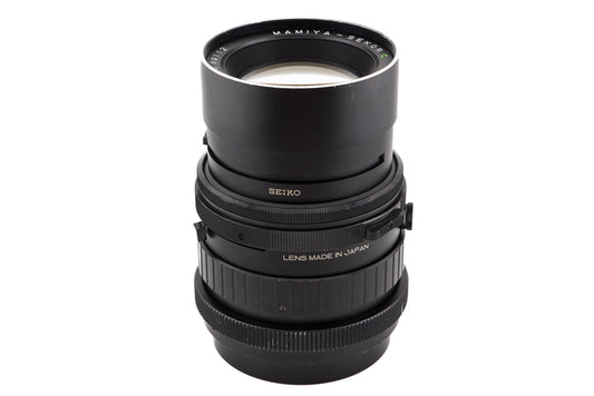 Manual focus telephoto prime lens made for RB67 120 SLR cameras by Mamiya. Gives the equivalent field of view to a 125mm lens on full frame/35mm. There are two versions of the lens; one with a tapered middle section and one with a straighter barrel. Metal body available in black.