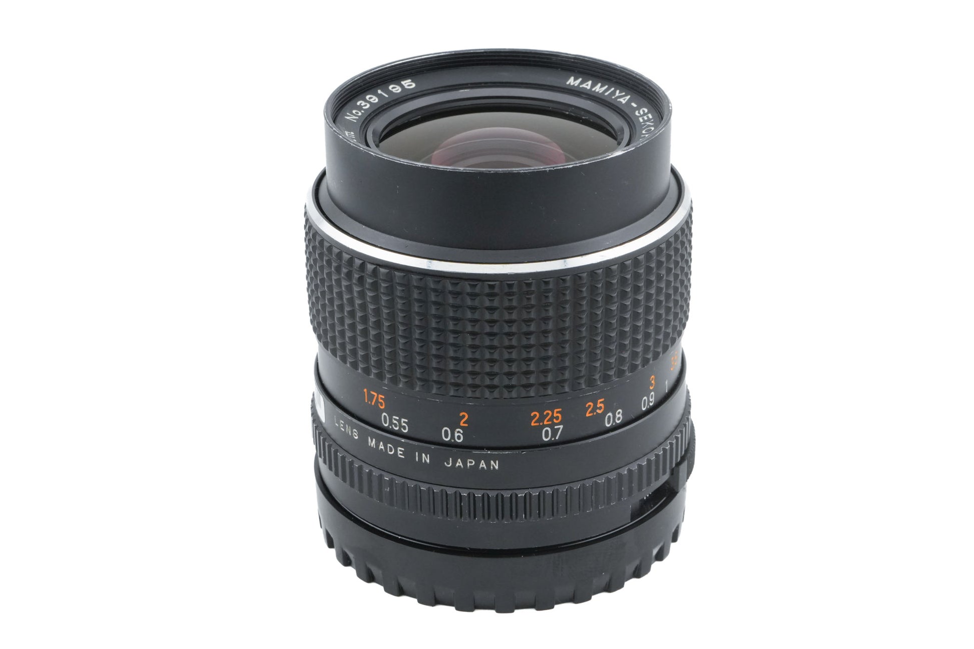 Manual focus wide-angle lens made for the Mamiya 645 system by Mamiya. The 35mm equivalent focal length is 34mm. Metal body available in black.