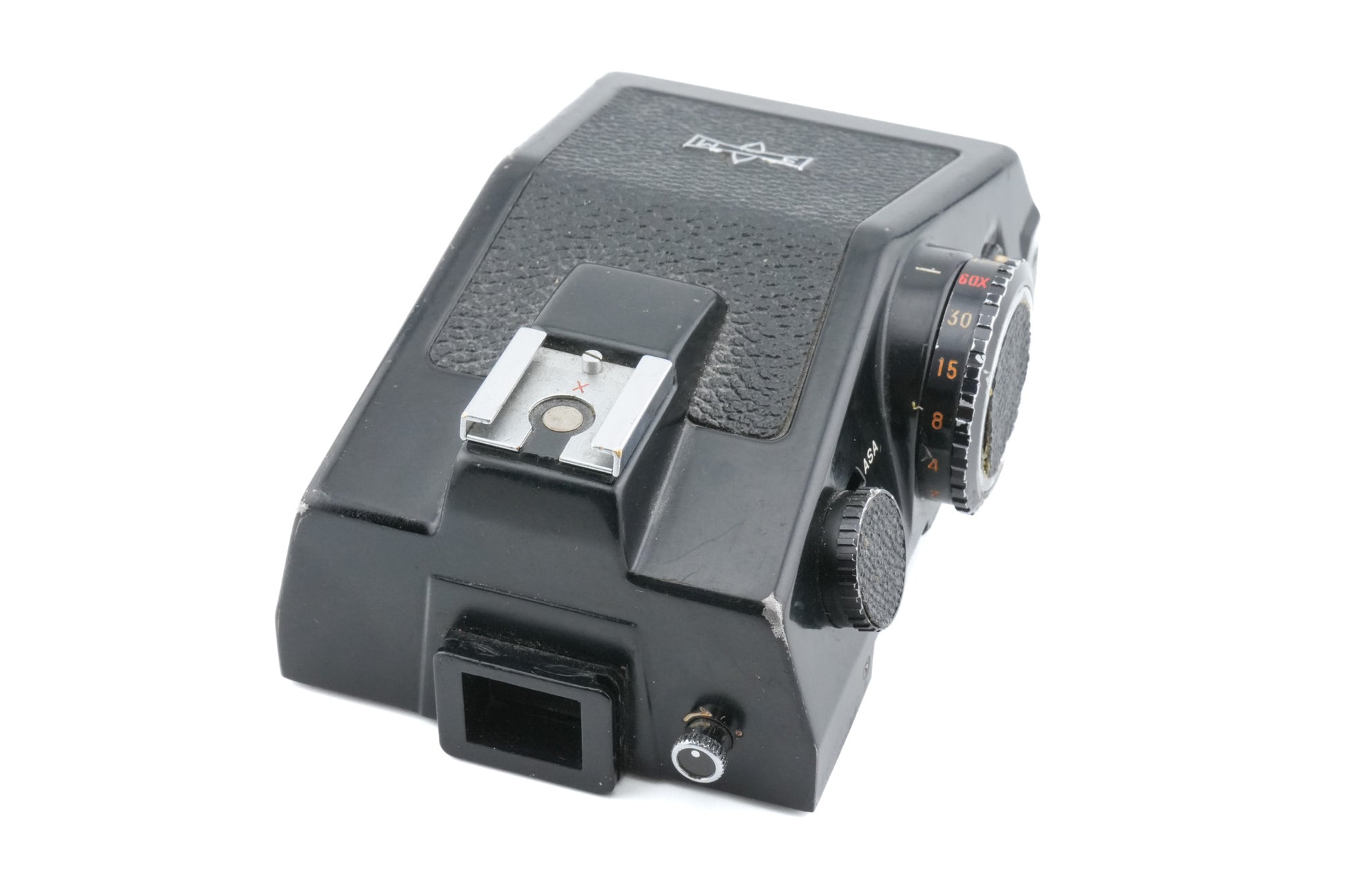 Metered 90-degree prism viewfinder made for M645 120 SLRs by Mamiya. It offers TTL metering with a CdS cell and can control the camera's shutter speeds as long as the camera's shutter speed dial is set to the red dot. When switched on, the exposure meter stays ON for 15 seconds and switches off automatically to prolong battery life. Metal and plastic body available in black.