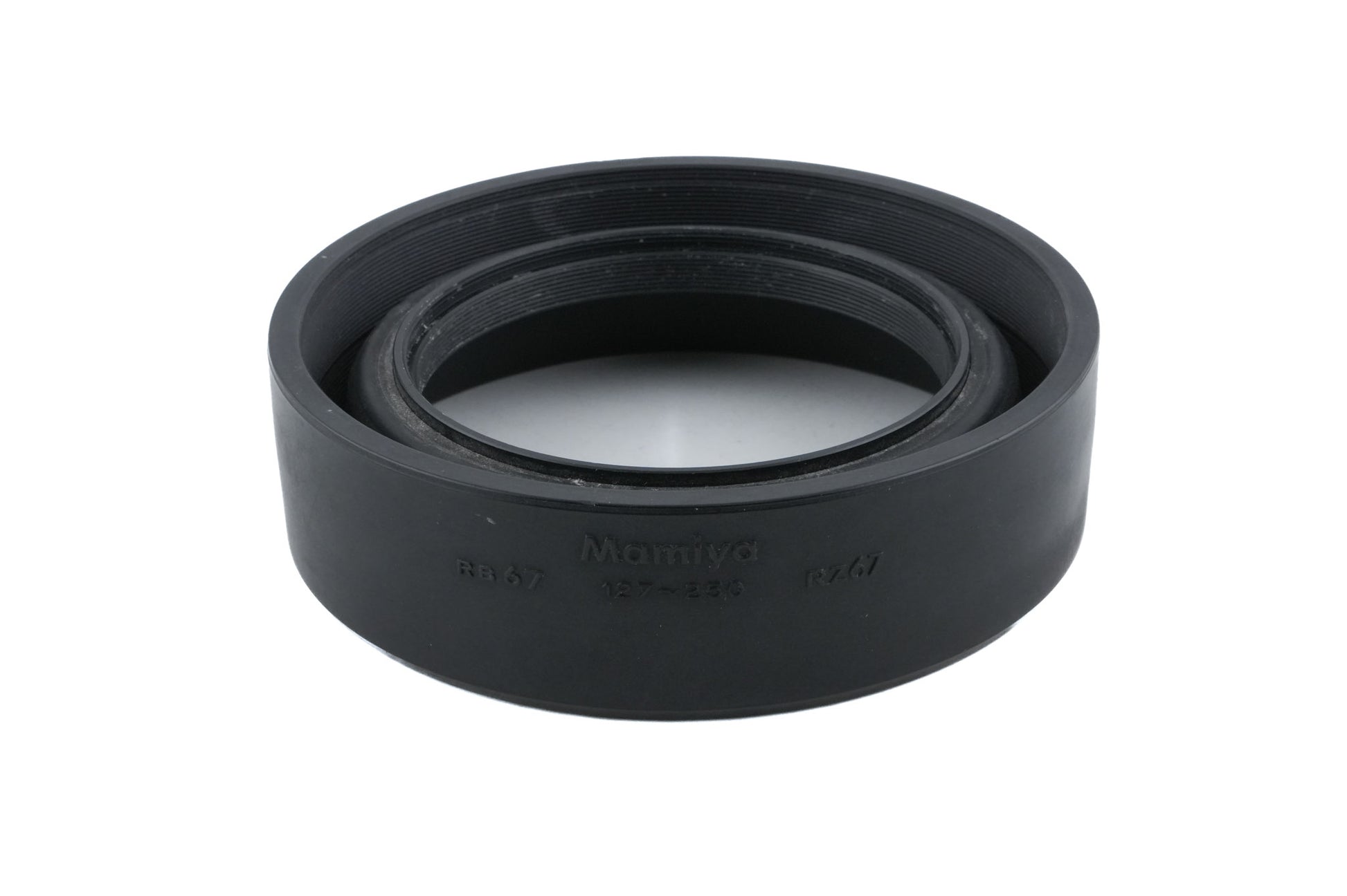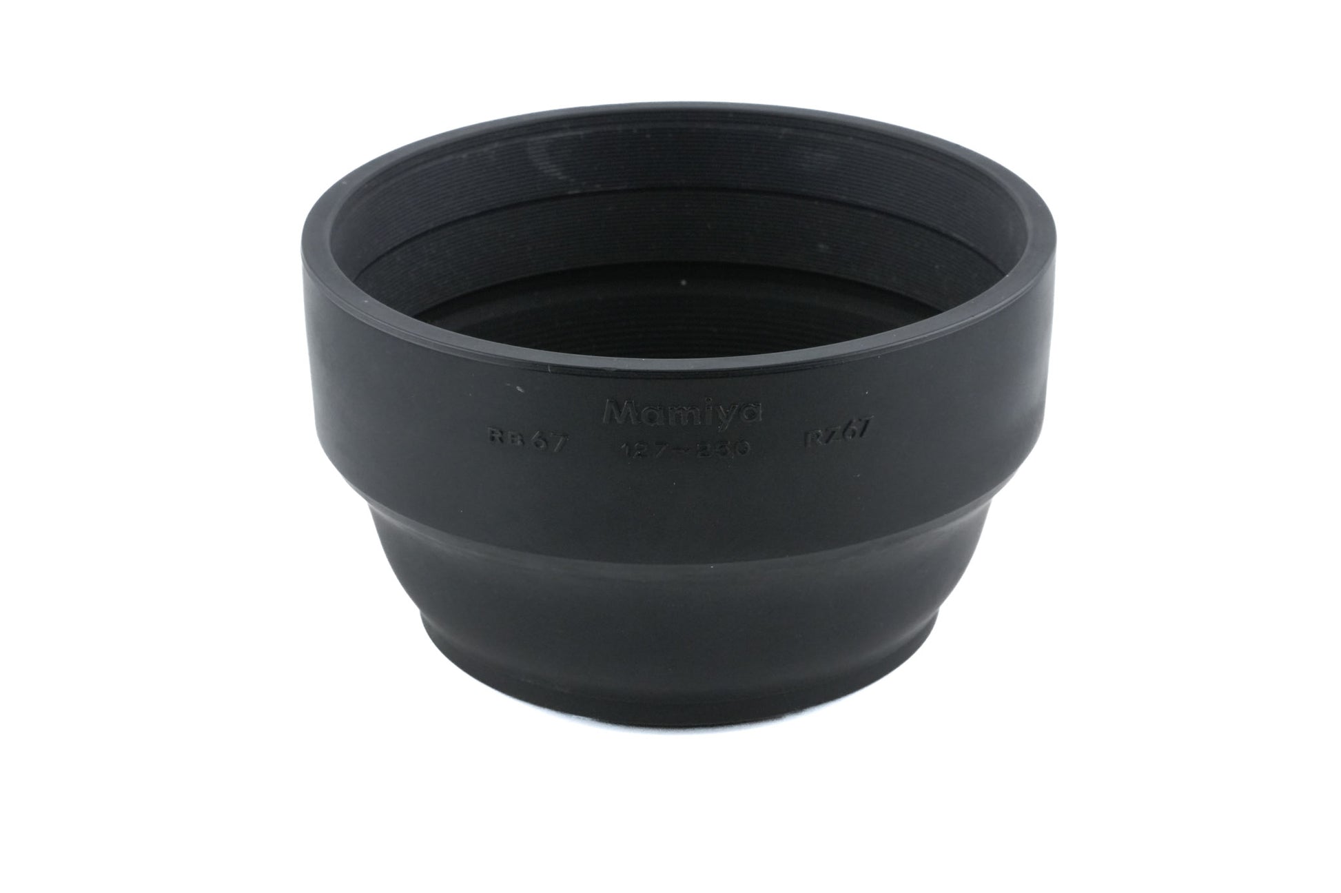 Lens hood made by Mamiya for 127-250mm RB67 and RZ67 lenses. Collapsible. Metal reinforced rubber construction in black finish.