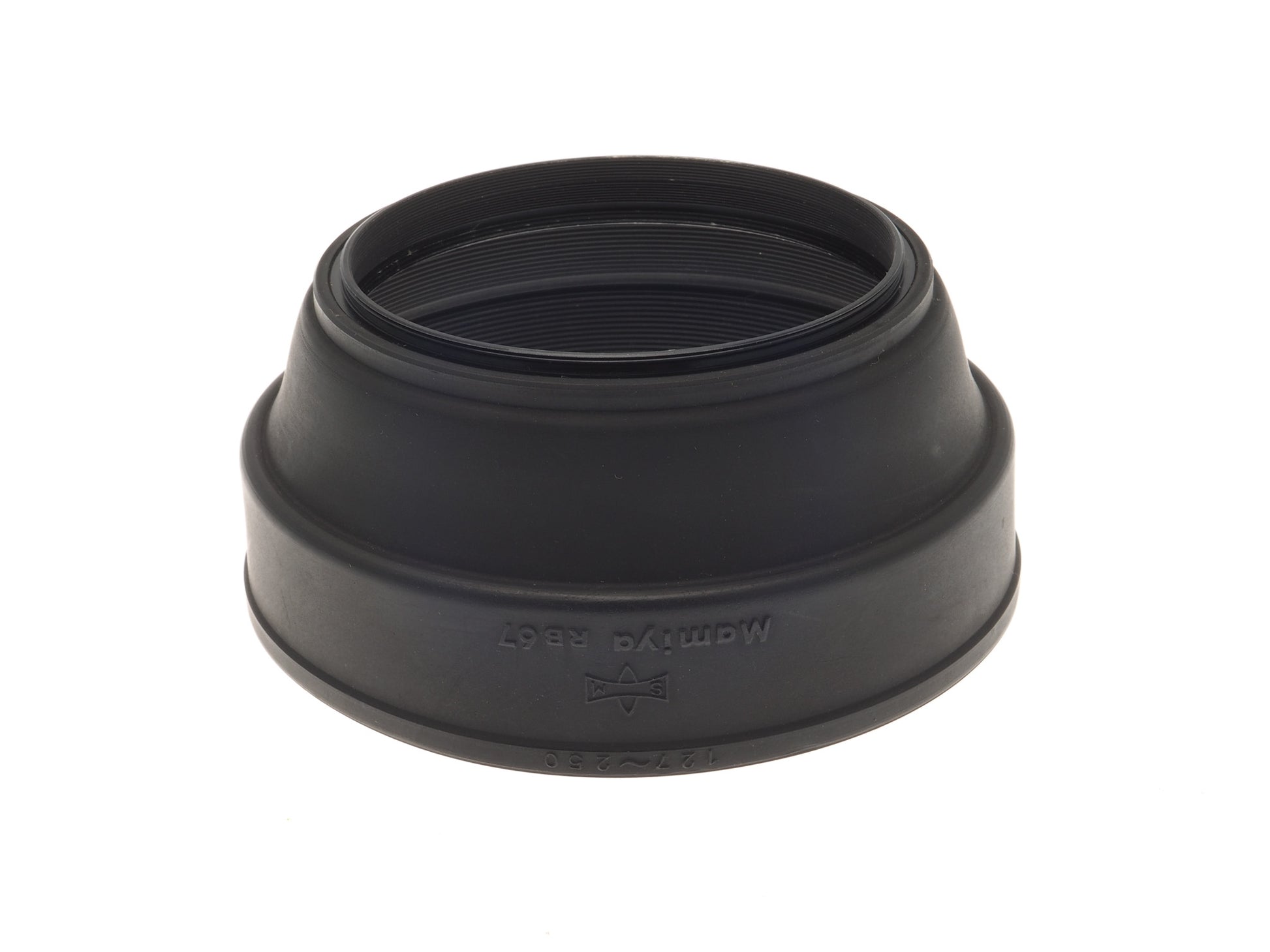 Lens hood made by Mamiya for 127-250mm RB67 and RZ67 lenses. Collapsible. Metal reinforced rubber construction in black finish.