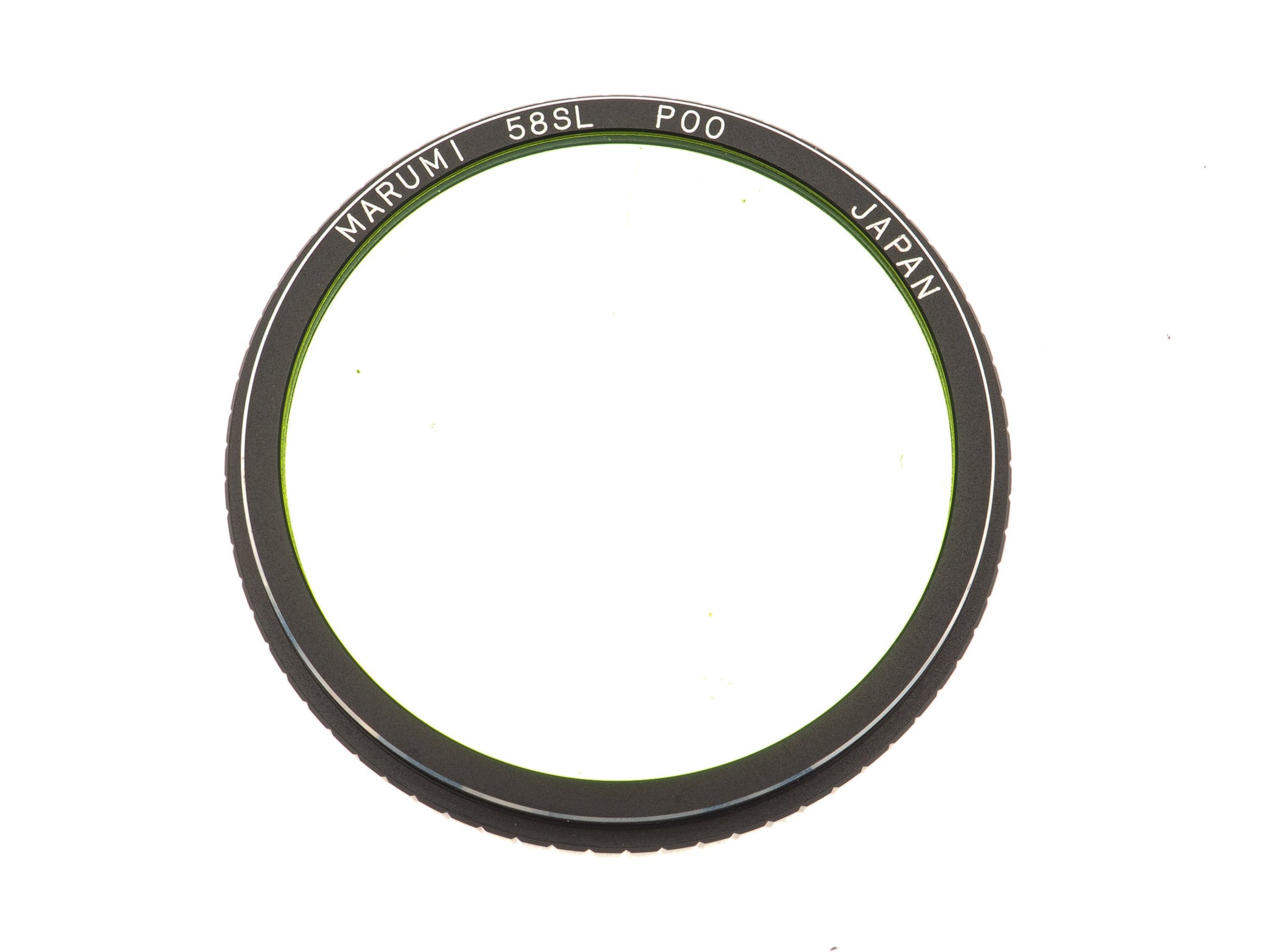 Green filter from Marumi, for lenses with 58mm filter threads. Lightweight black metal construction, with knurled edges.