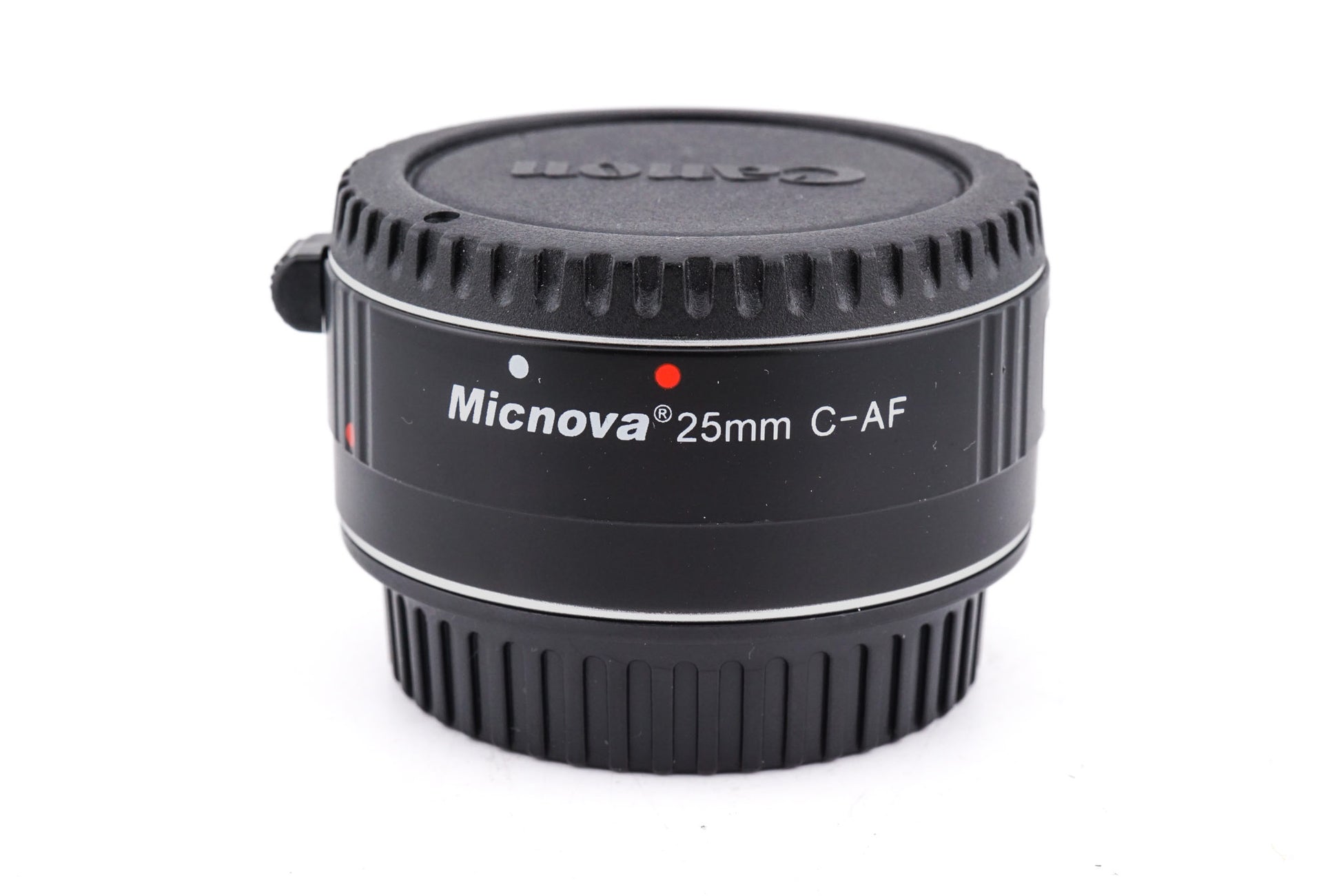 Extension tube made for Canon EF & EF-S mount SLRs by Micnova. Provides 25mm of extension with autofocus and aperture control pass-through. Plastic body available in black.