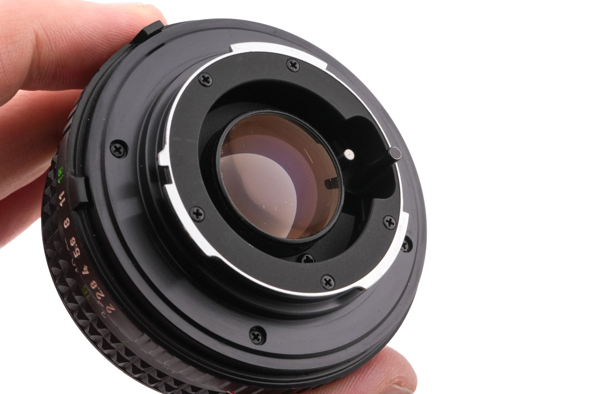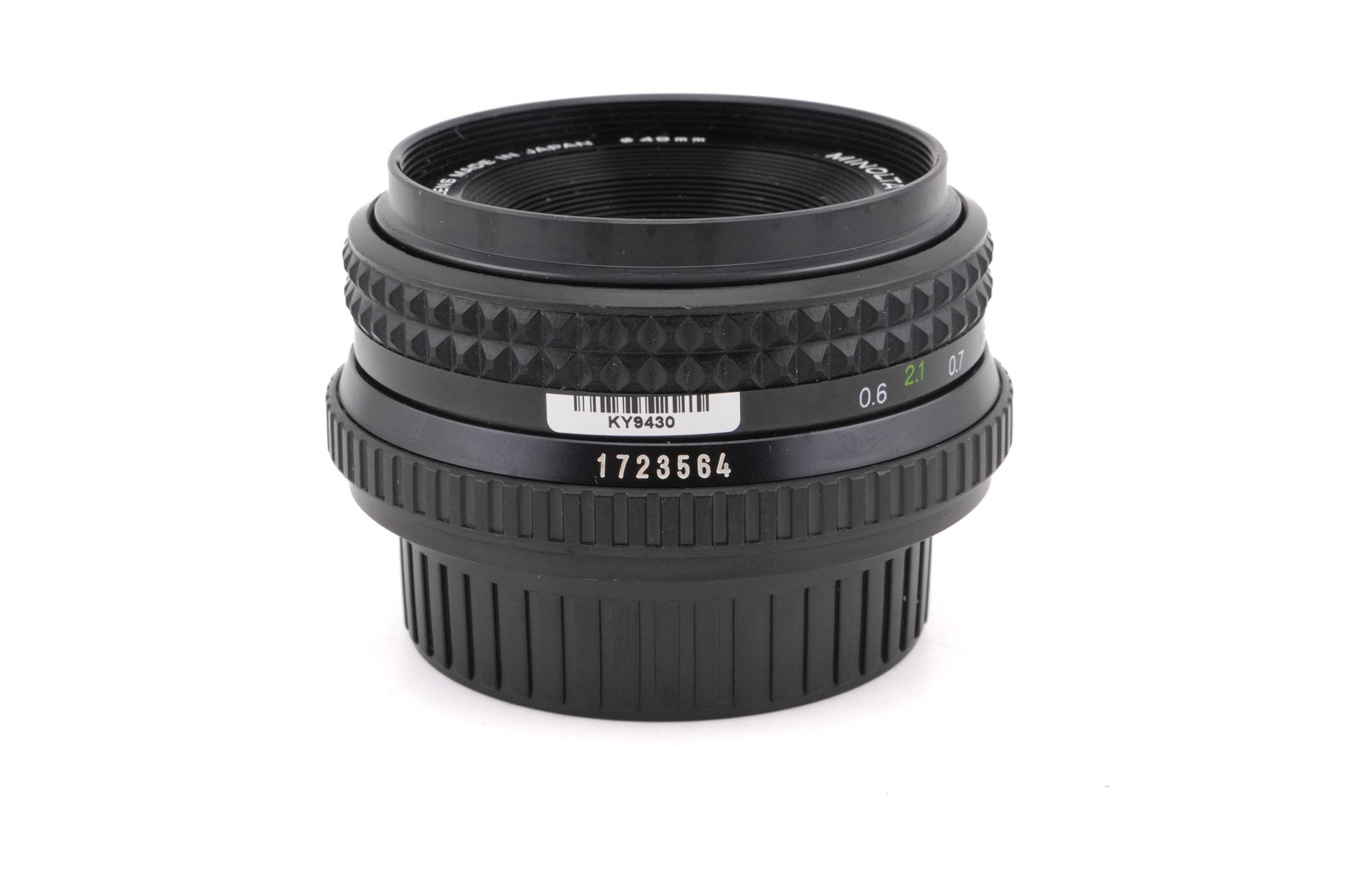 Manual focus normal lens made for MD-mount 35mm SLR cameras by Minolta. Metal body available in black.