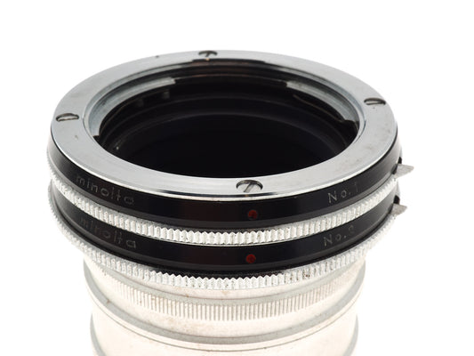 Extension tube set made by Minolta for use on Minolta MD mount cameras and lenses. Set made up of four or five pieces. Available in silver or black metal.