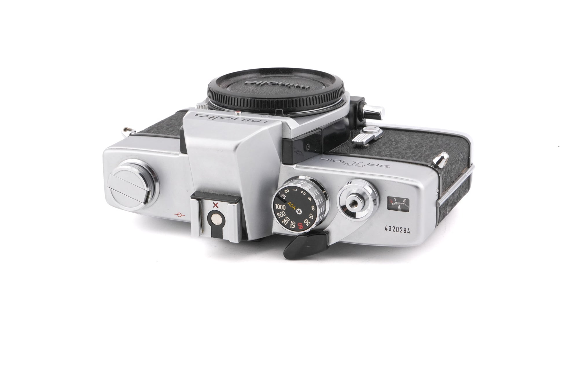 Manual focus Minolta MD mount 35mm SLR released by Minolta in 1966. It uses Minolta's CLC system, an early form of matrix metering that uses two photocells to calculate average exposure. The B model removed the mirror lock-up functionality but added a hot shoe. The camera is also known as the SR-T 201 (NA) and SR 101 (JP). Metal body available in black & silver.