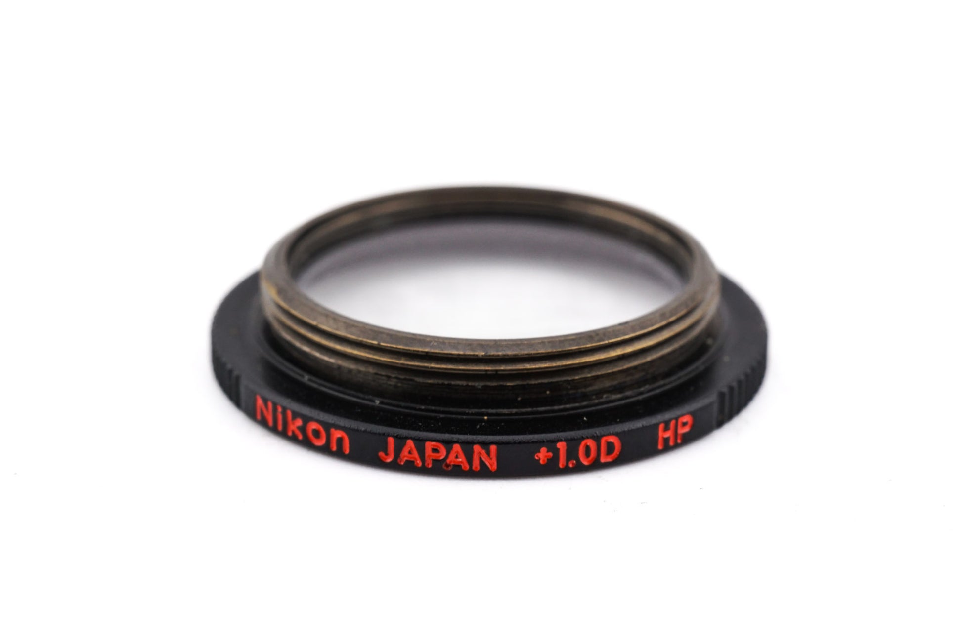 +1 diopter lens for Nikon F mount SLR cameras with 19mm round internally threaded eyepiece. Some models specifically marked for F3 or F3 HP. Metal outer ring in black finish.
