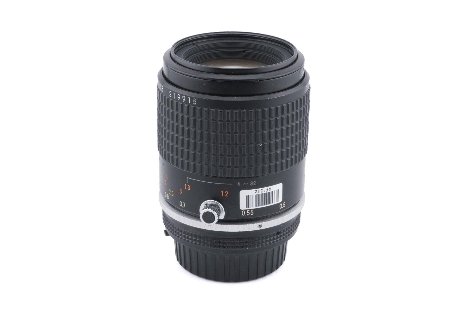 Manual focus telephoto macro lens made for F-mount 35mm SLR cameras introduced by Nikon in 1983. It features Nikon’s CRC (close-range correction) -system to improve optical performance at any focusing distance. Metal and plastic body available in black.