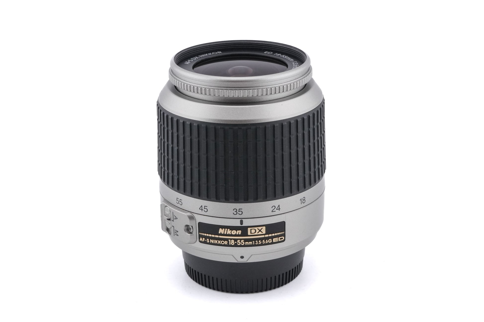 Autofocus standard zoom lens made for DX-mount DSLR cameras by Nikon. This is the first version. Plastic body available in black and silver.
