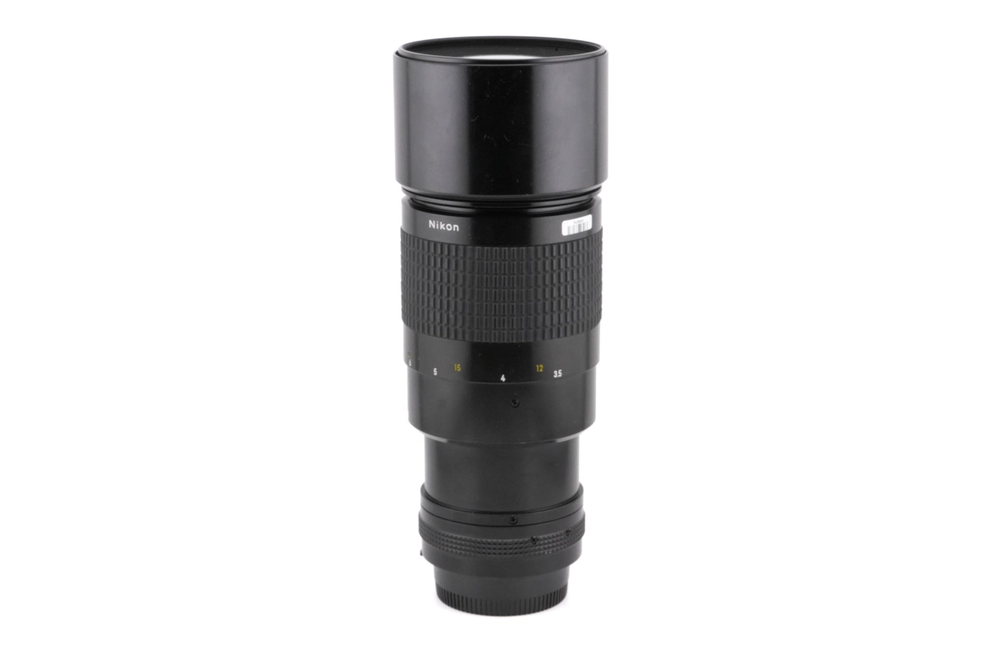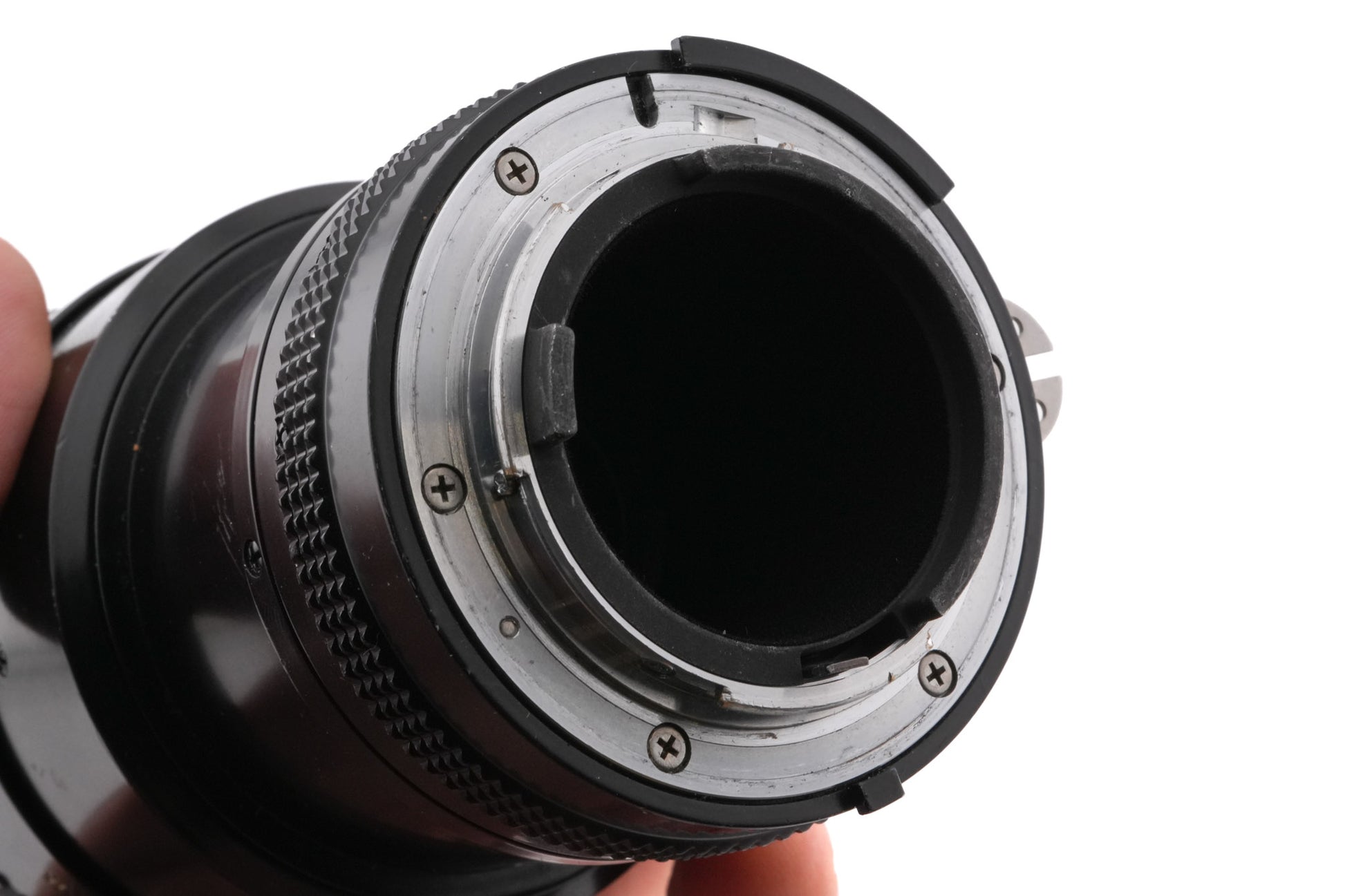 Manual focus telephoto lens made for F-mount SLR cameras by Nikon starting in 1981. It has a built-in tripod mount and lens hood. Metal body available in black.