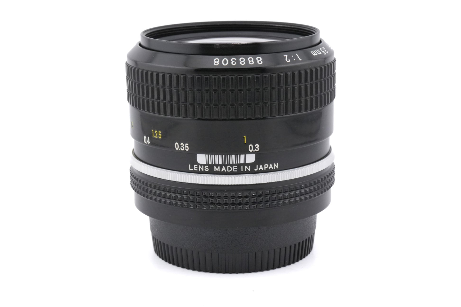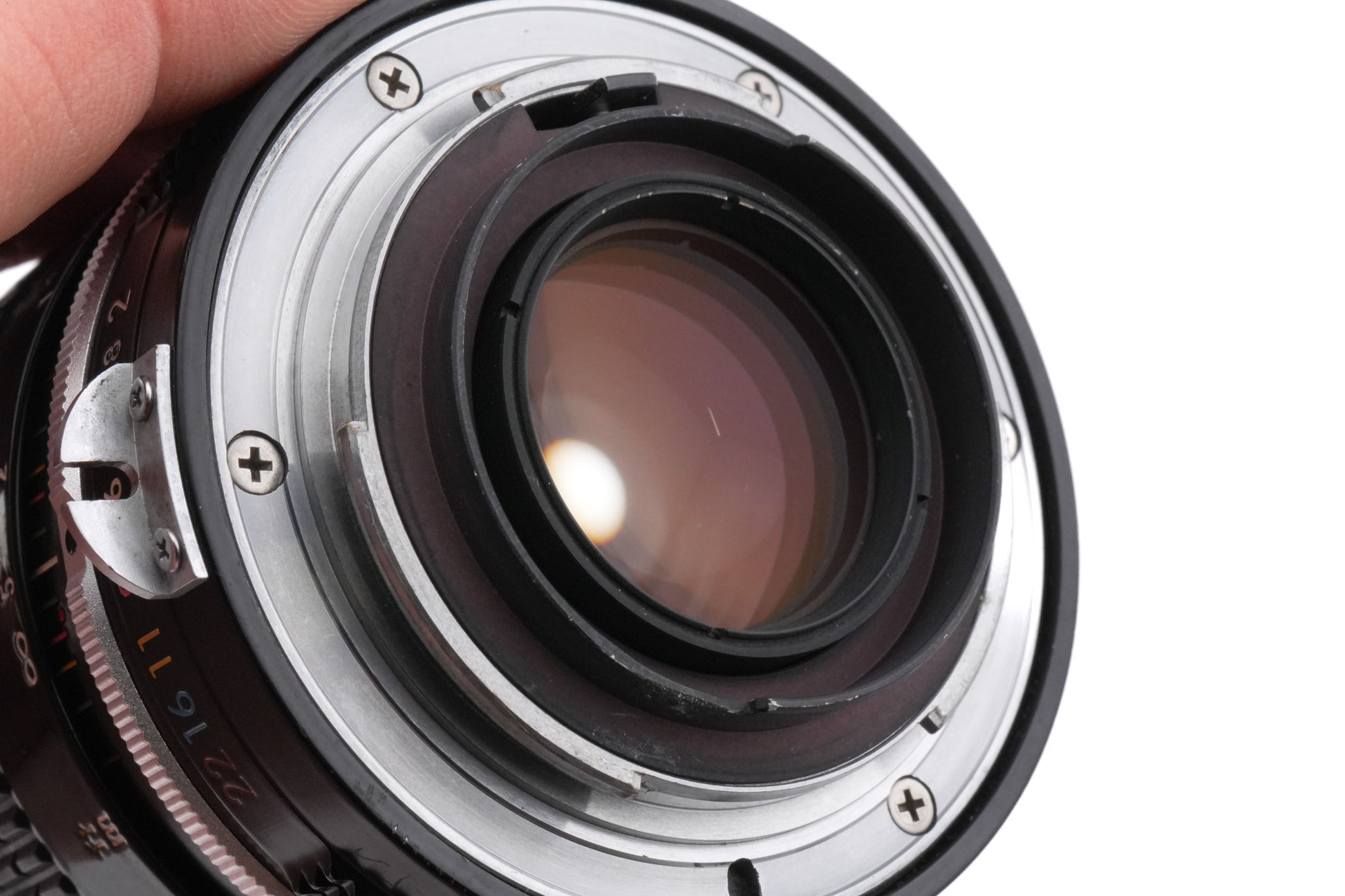 Manual focus wide normal lens made for F mount SLR cameras by Nikon. Pre-AI lens with only bunny ear metering prongs, meaning that the lens will only meter properly on older Nikon bodies including F, F2, and Nikkormat cameras. This lens has the same optical formula as the earlier Nikkor-O model, just with multicoating. Metal body available in silver & black.