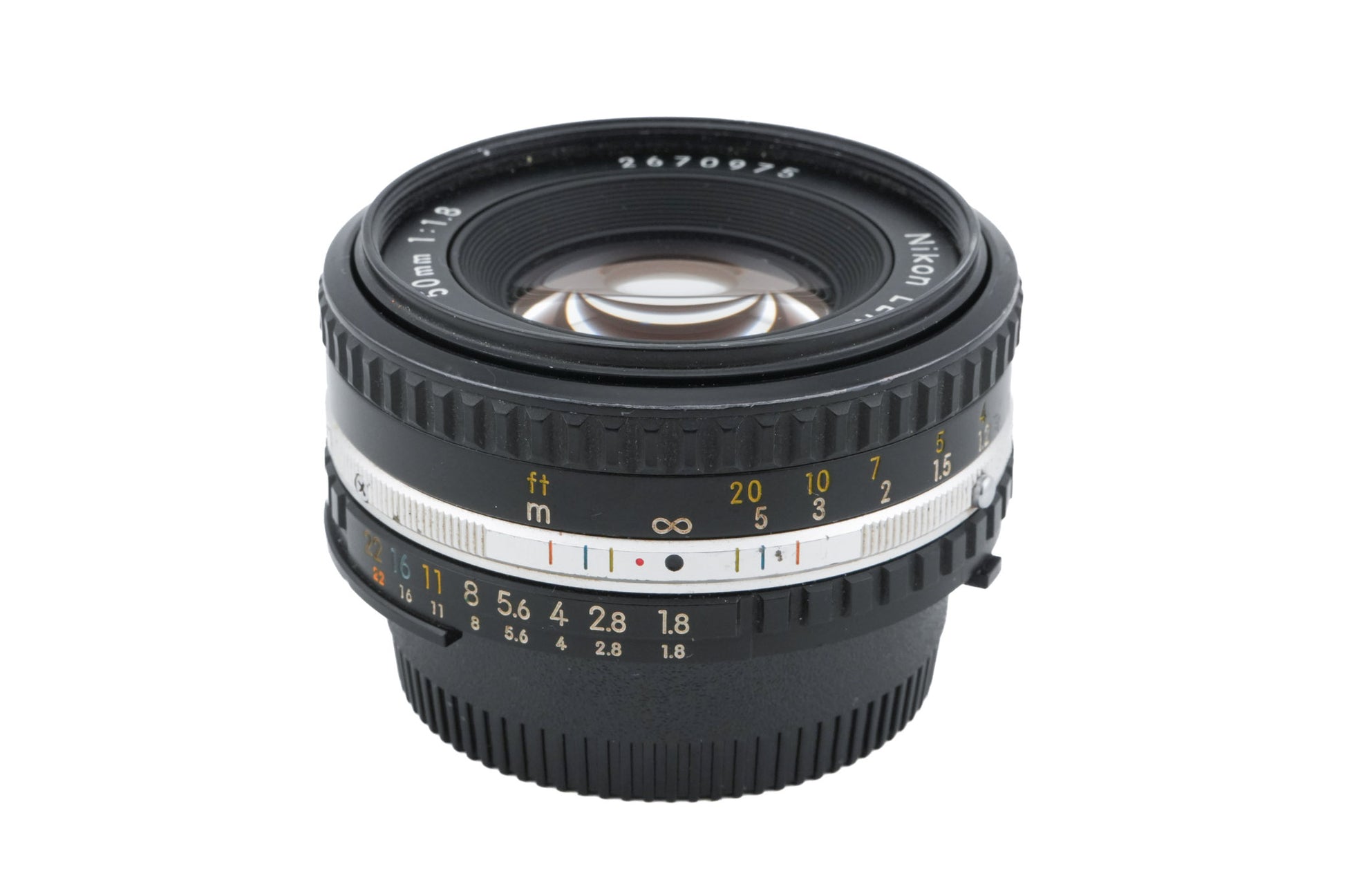 Manual focus normal lens made for F-mount 35mm SLRs by Nikon. It does not have the bunny ear metering prongs but does have the AI ridge and AI-S indent, so it will meter properly on nearly all manual focus Nikon cameras (excluding F, F2, and Nikkormat) and will work with the advanced program modes of later models. Early versions are all black, and later versions have a chrome ring. Metal and plastic body available in black.