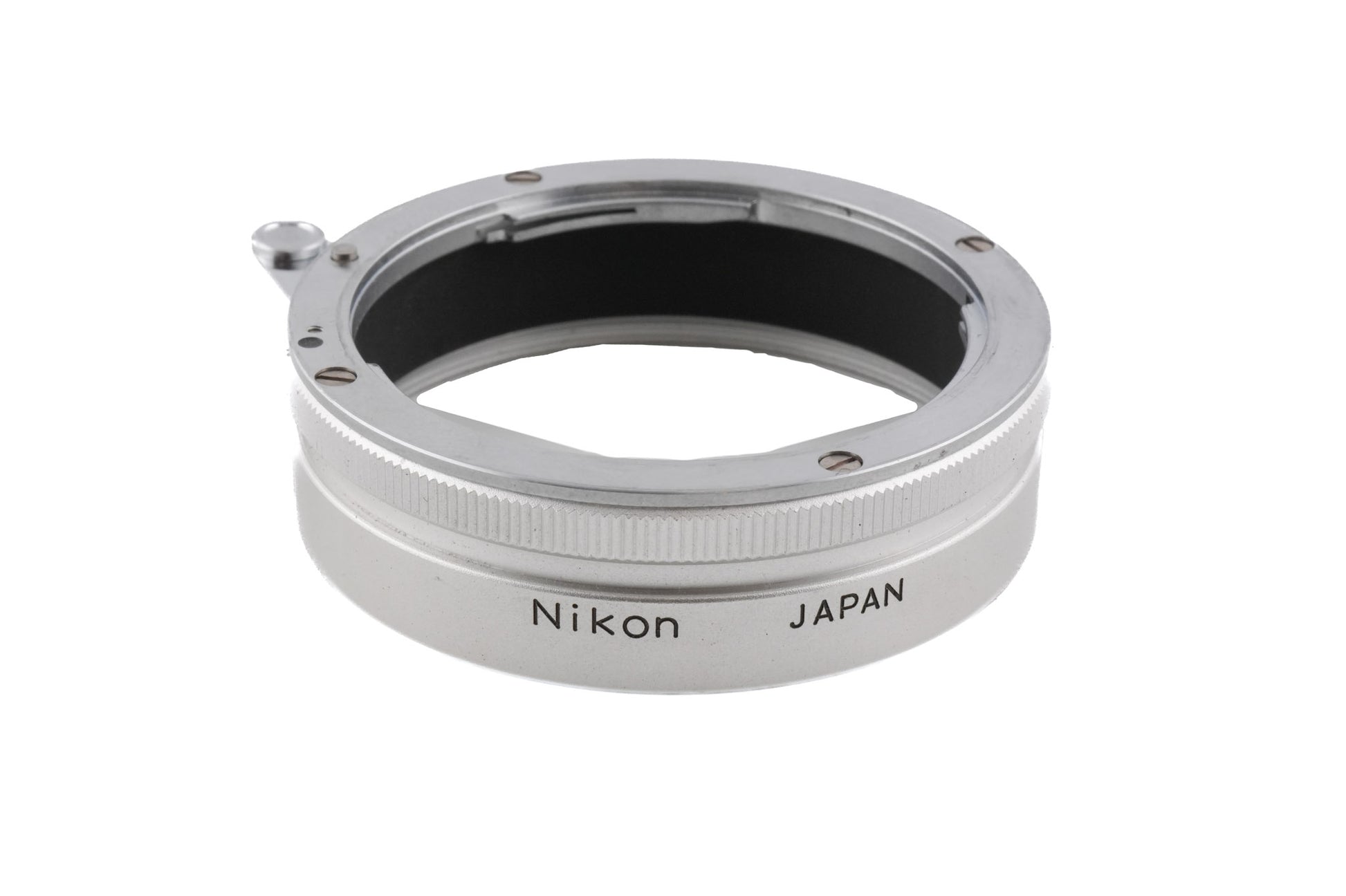 Adapter Ring for Bellows Attachment Model 2 made by Nikon. A useful adapter that converts the bayonet mount of reverse mounted lenses to the 52mm thread used for filters and hoods. Metal body available in black and silver.