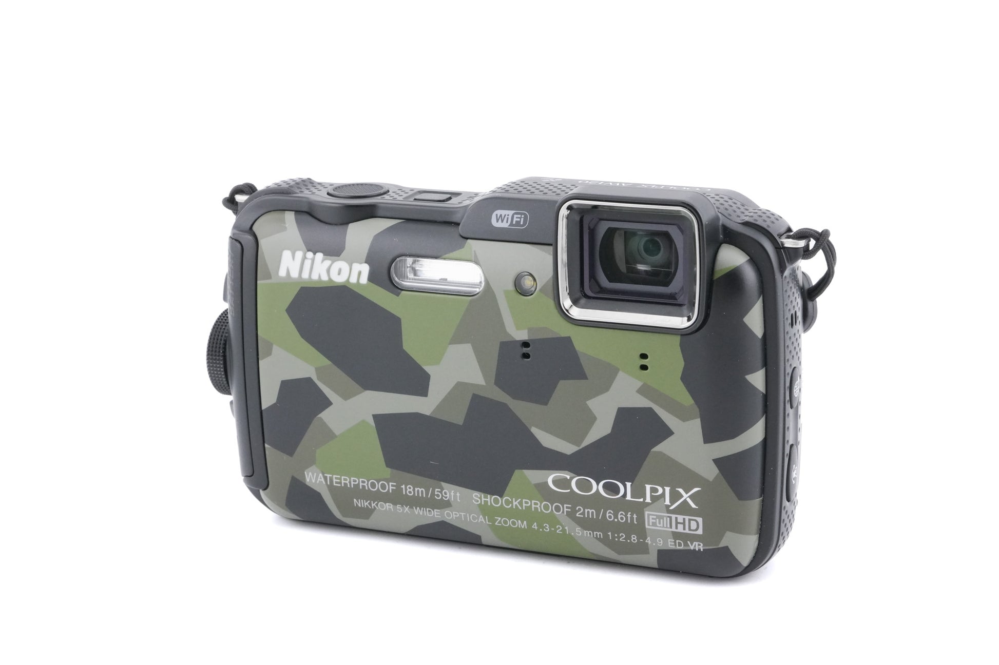 Digital compact camera released by Nikon. Rugged water/shock and freezeproof structure. Nikon VR stabilization and 24 - 120 mm equivalent lens. Plastic body available in black, yellow, orange, blue and camouflage.