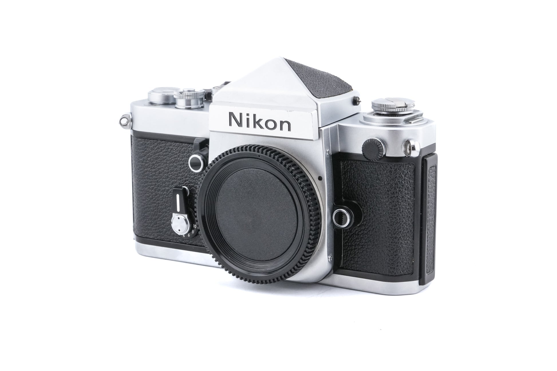 Manual focus F-mount 35mm SLR released by Nikon in 1971. This is the base F2 with a non-metered DE-1 prism finder, often referred to as a "plain prism F2". Metal body available in black and silver.