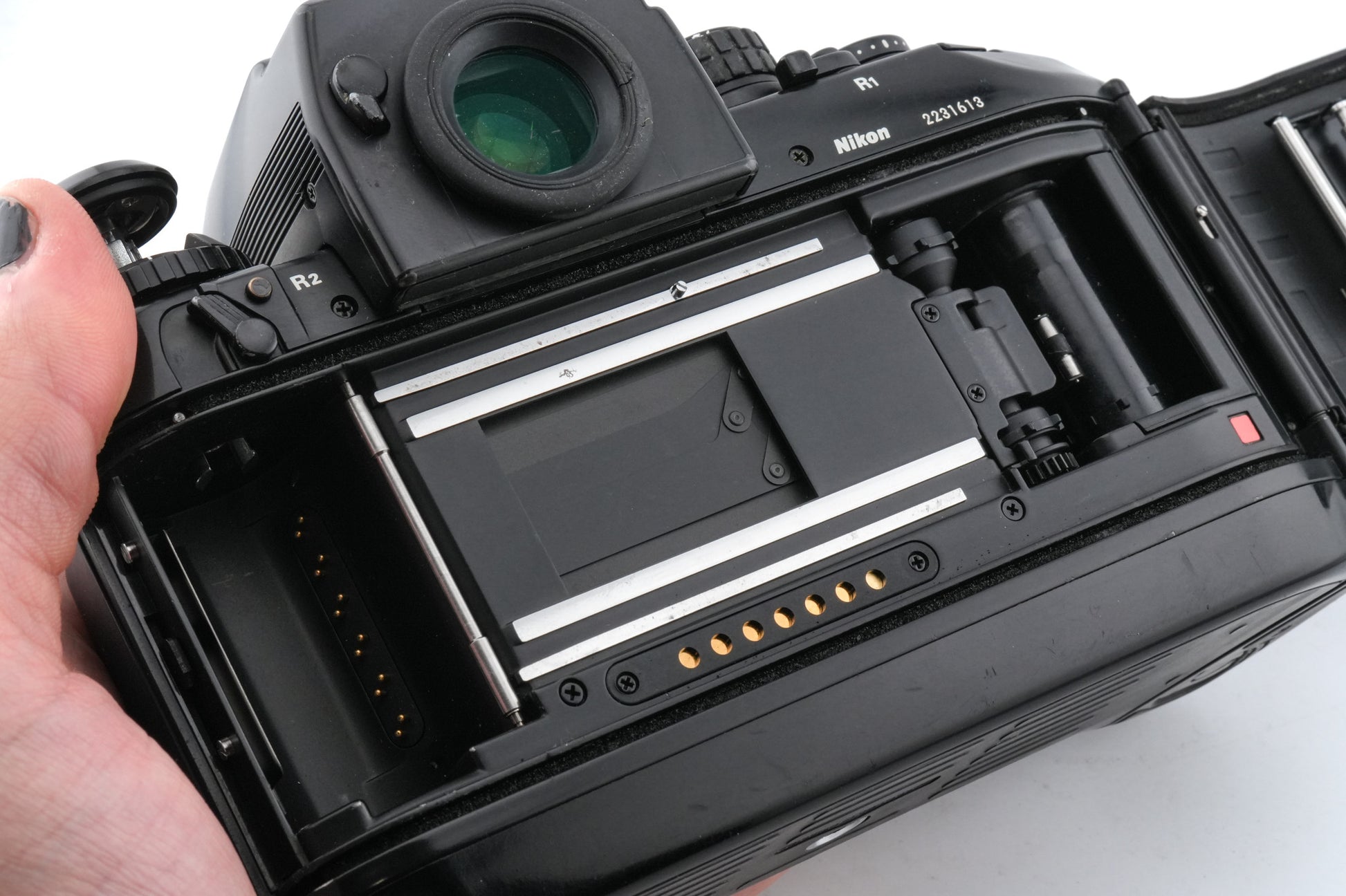 Autofocus F-mount 35mm SLR released by Nikon in 1988. This is the base F4 with the MB-20 battery grip. The body has matrix metering, weather sealing, interchangeable grips, finders, and focusing screens. It will work natively with AI and AI-S lenses (including matrix metering!) as well as autofocus lenses with aperture rings. Later autofocus lenses without aperture rings can only be used in program and shutter priority modes and without image stabilization (VR). Metal and plastic body available in black with a red accent.