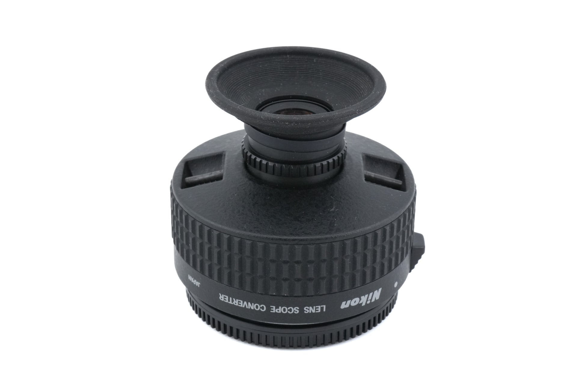 Lens scope converter made by Nikon. It is used to turn Nikon lenses into scopes. It will not work with newer G lenses. A 50mm lens becomes a 5x power telescope, and so on. Metal and plastic body available in black.