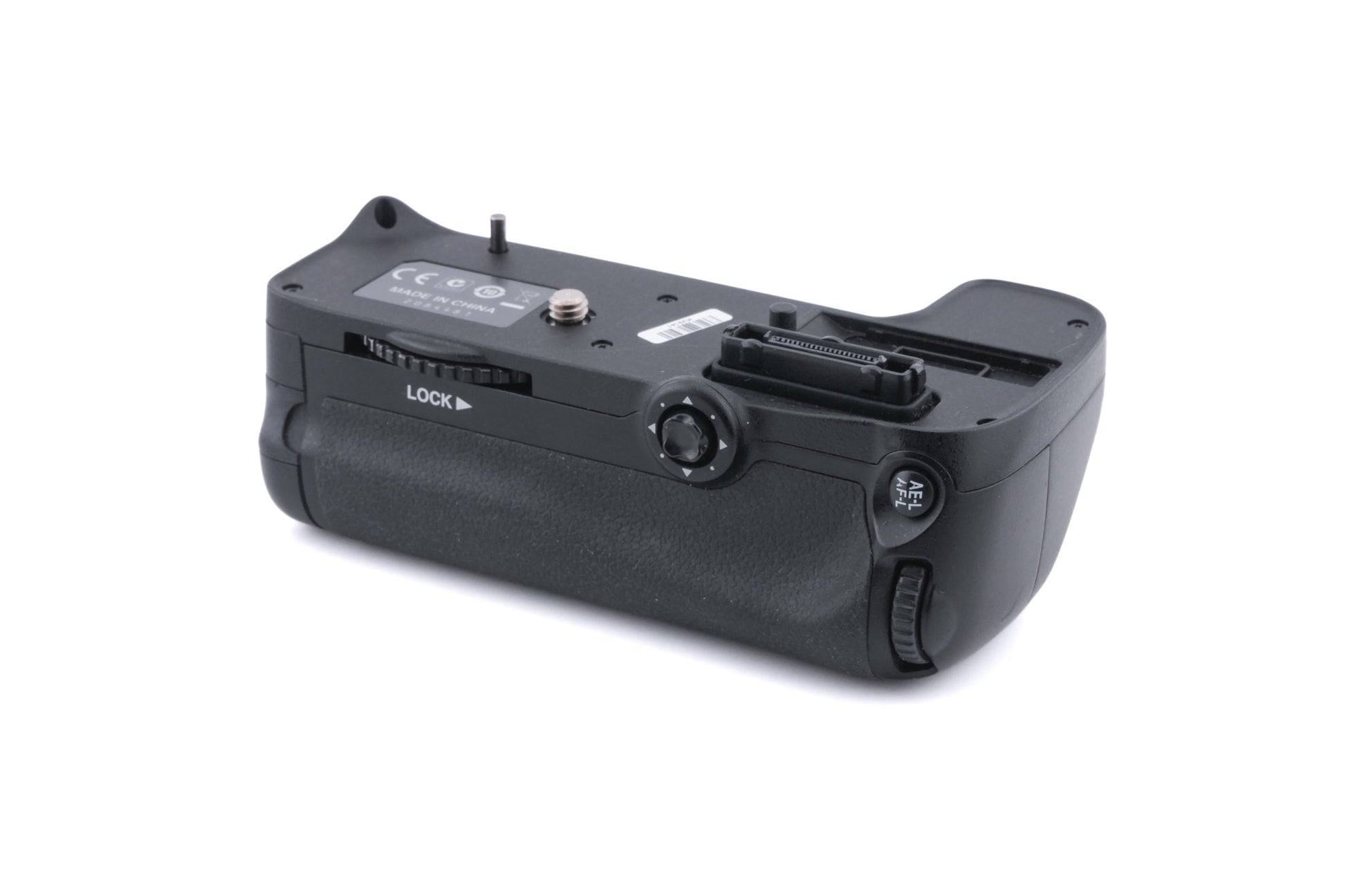 Battery grip for Nikon D7000. Accepts EN-EL15 battery or six AA-batteries with holder. Has a vertical shutter release button, two command dials, multi-selector and AE-L/AF-L button. Plastic body available in black.