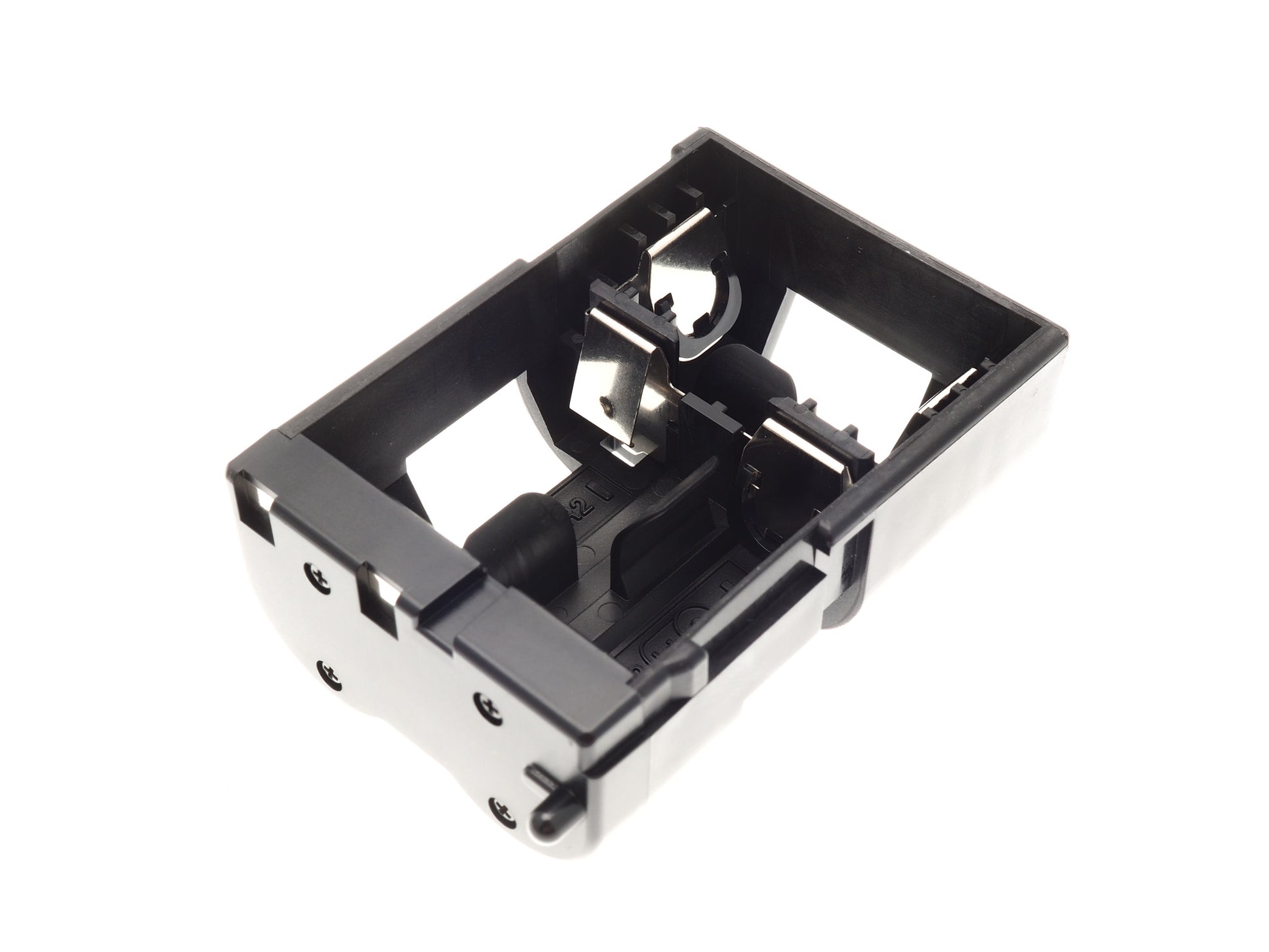 Battery holder made for F-mount SLRs by Nikon. It allows 3 CR2 batteries to work in place of an EN-EL3a battery. Plastic body available in black.