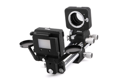 Bellows unit made for F-mount lenses and cameras released by Nikon in 1970. It is the only model with tilt/shift capabilities. To switch between tilt/shift, the bellows can be mounted on a tripod head tilted 90 degrees. Metal body available in black.