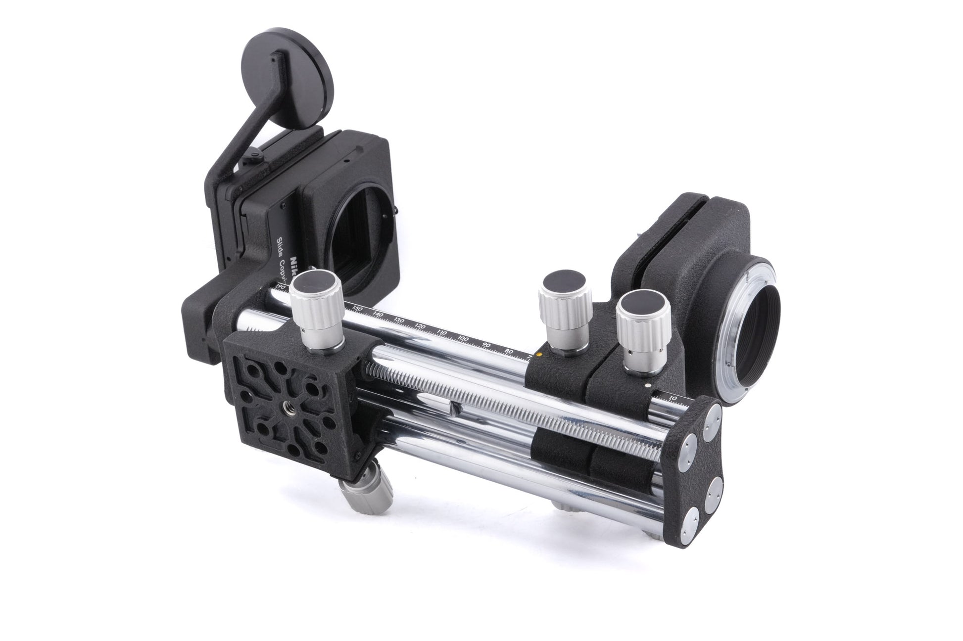 Bellows unit made for F-mount lenses and cameras released by Nikon in 1970. It is the only model with tilt/shift capabilities. To switch between tilt/shift, the bellows can be mounted on a tripod head tilted 90 degrees. Metal body available in black.