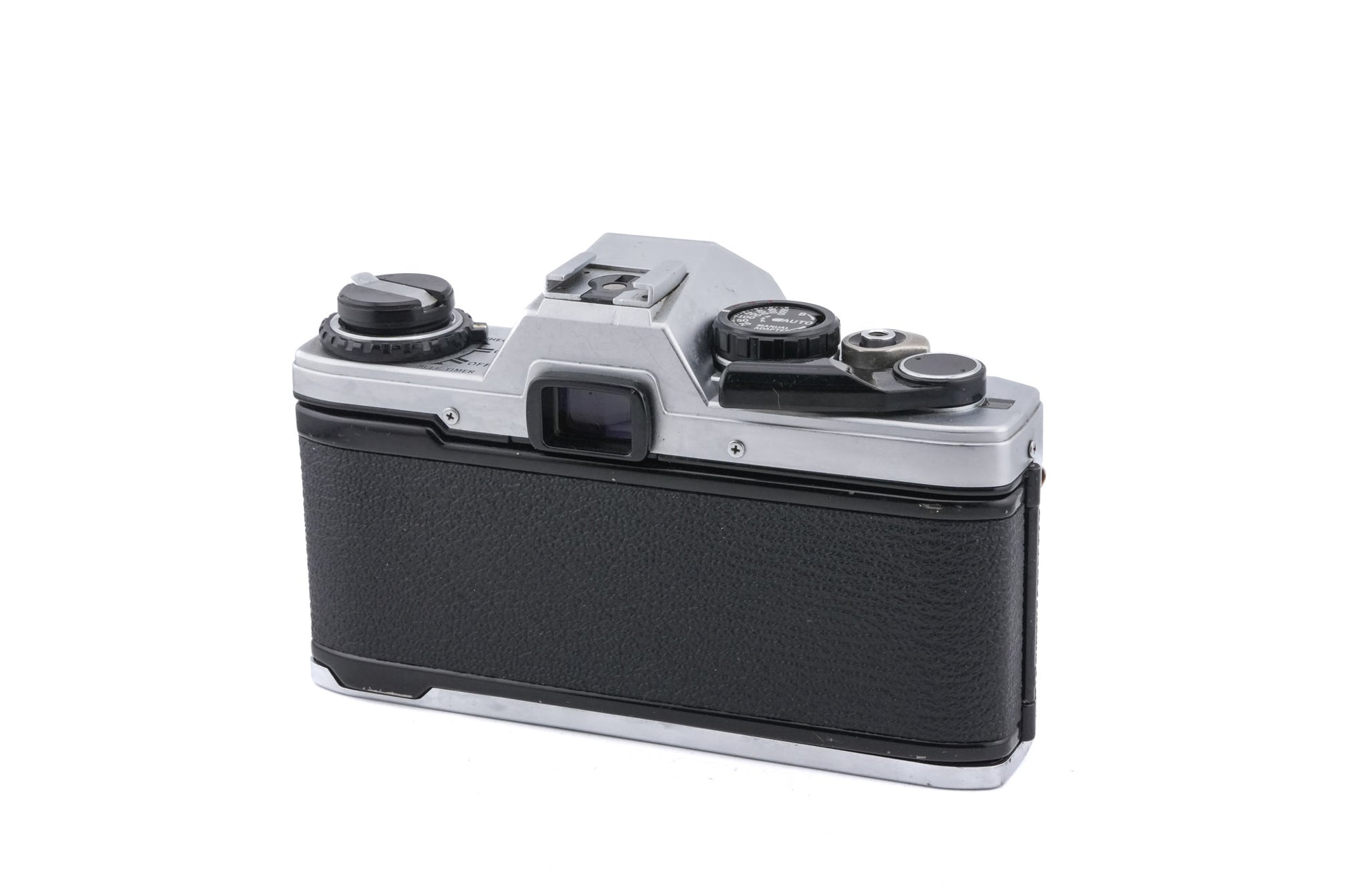 Manual focus OM-mount 35mm SLR released by Olympus in 1979. This was the first of Olympus' 2-digit OM series aimed at consumers instead of professionals. Fires only in aperture priority mode unless the optional manual adapter is attached. It has a self-timer, a hot shoe, and +/- 2 exposure compensation. Metal body available in silver.