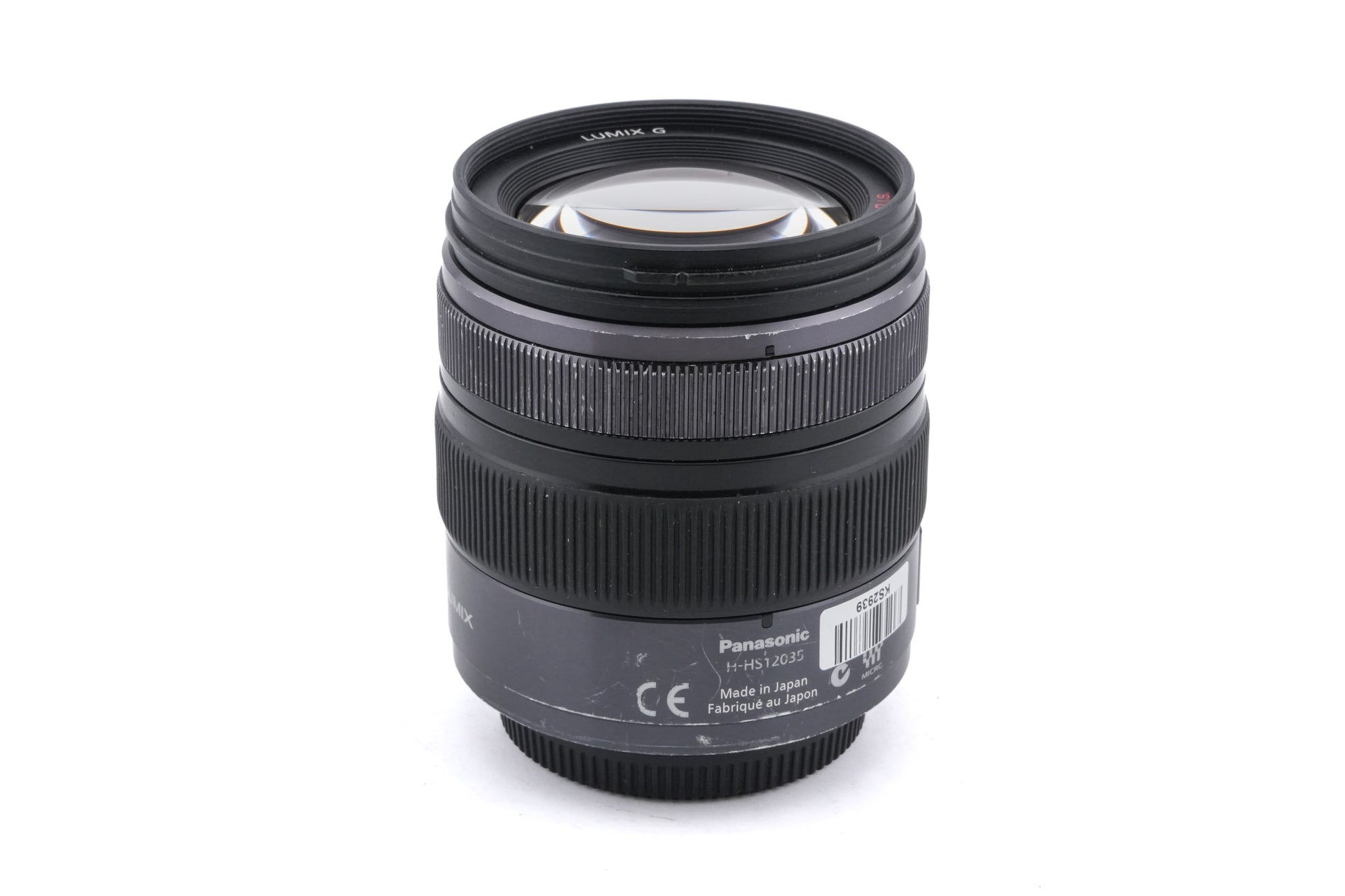Autofocus general purpose zoom lens made for Micro Four Thirds mount mirrorless digital cameras by Panasonic. It gives the equivalent field of view to a 24-70mm lens on full frame/35mm. The lens features optical image stabilization (O.I.S.). The product code is H-HSA12035. Plastic body available in black or metallic blue.