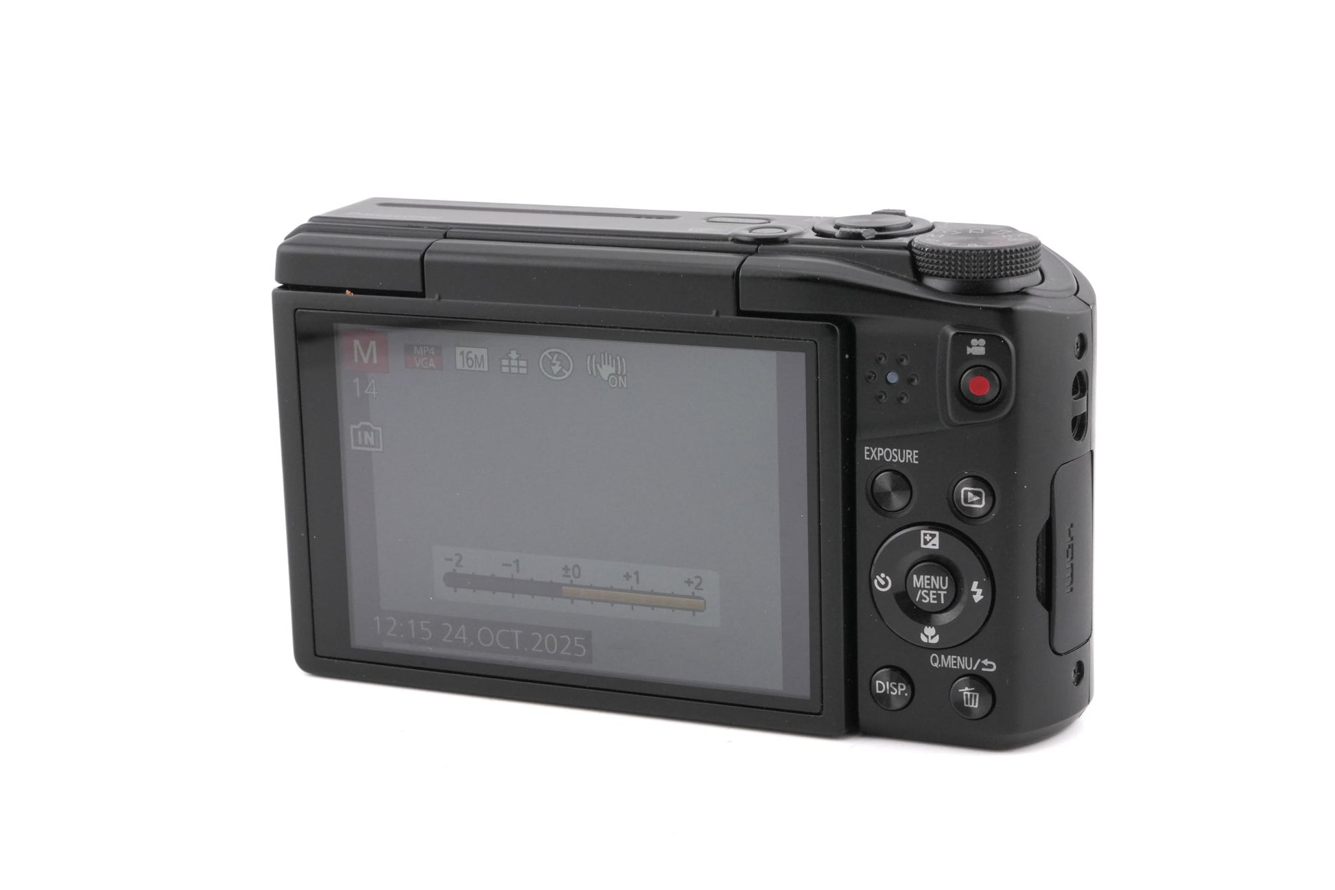 Autofocus digital compact camera made by Panasonic in 2015. Metal/plastic body available in black.