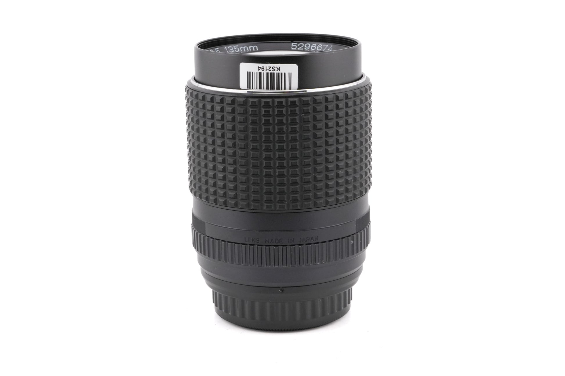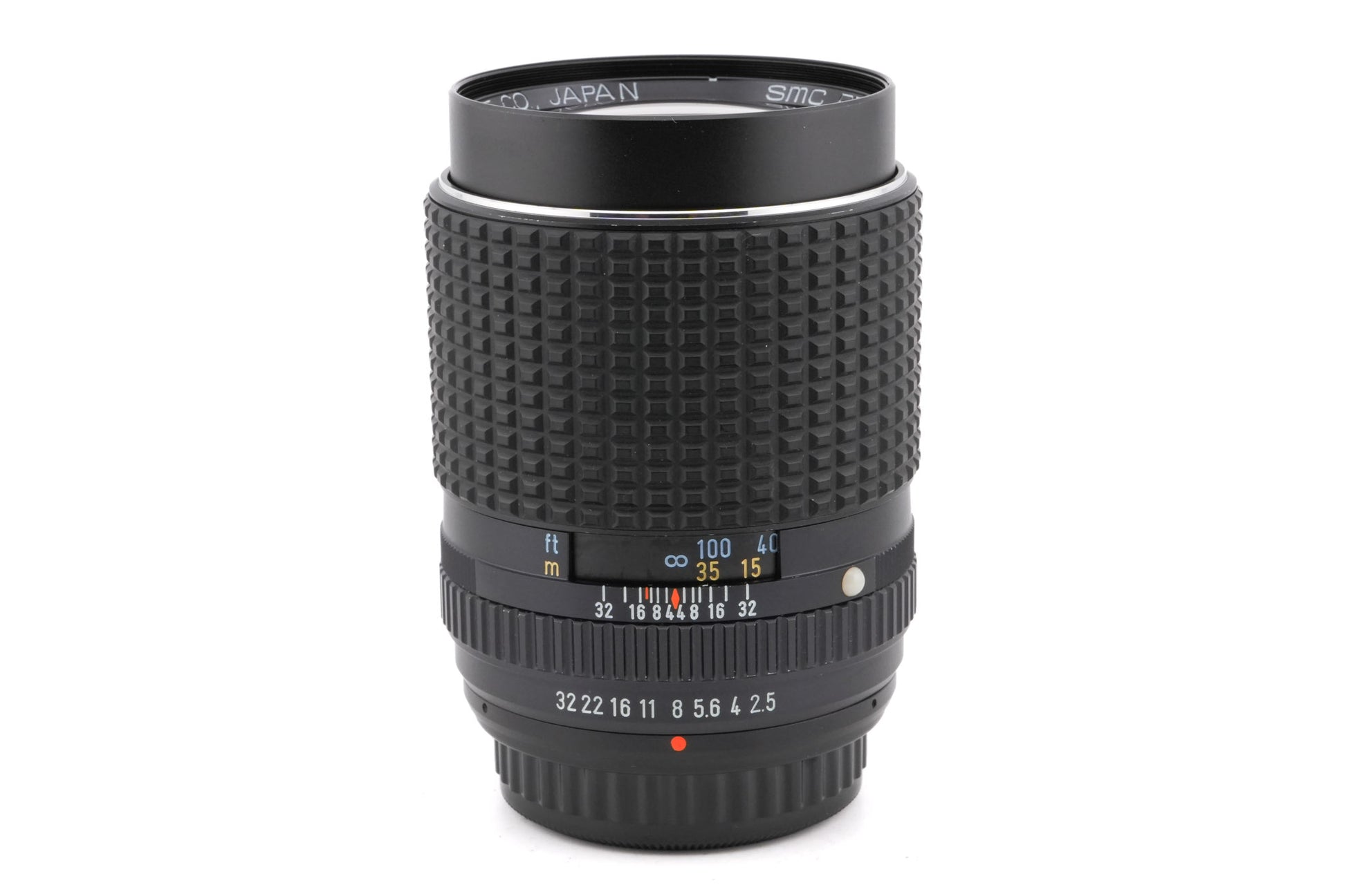 Manual focus telephoto lens made for K-mount SLR cameras by Pentax. This is an early version of Pentax's 135mm f2.5 from before the advent of the SMC Pentax-A and Pentax-M lines. It functions similarly to the Pentax-M line of lenses and cannot be used with the program modes of later cameras. Metal body available in black.