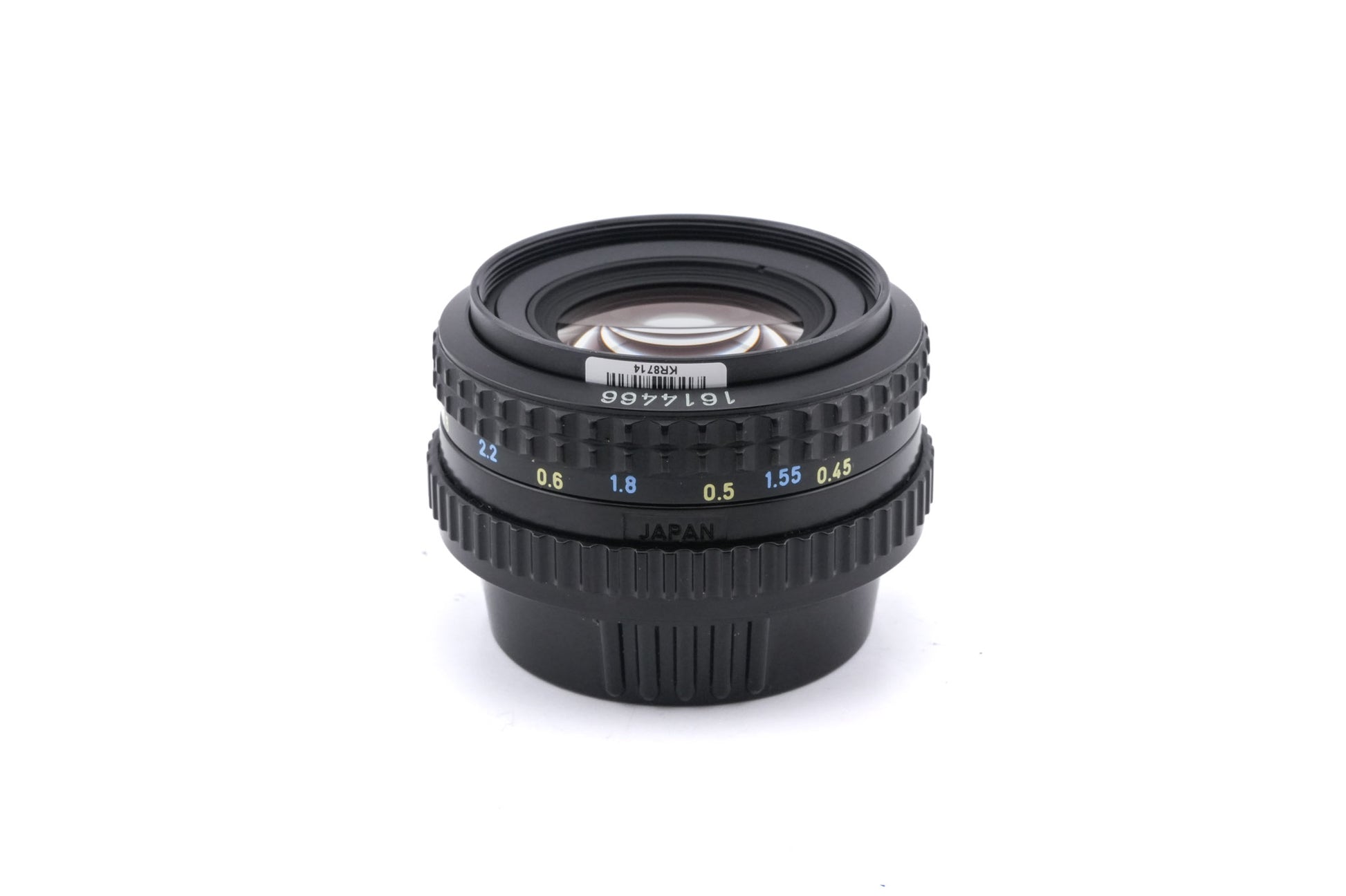 Manual focus normal lens made for K-mount SLRs by Pentax. This Pentax-A model works with advanced auto exposure modes of later manual focus Pentax film cameras. Metal and plastic body available in black.