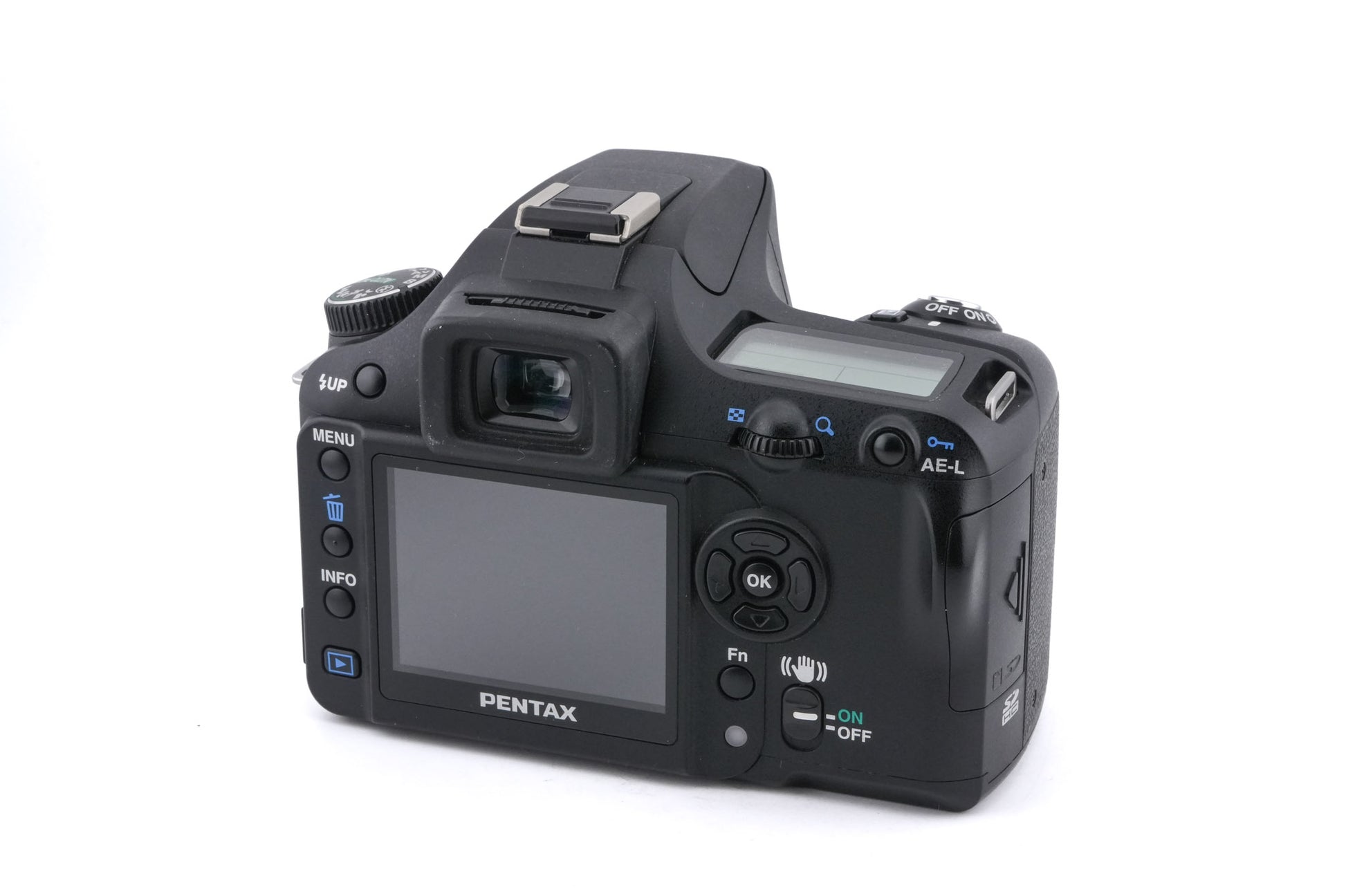Autofocus APS-C K-mount DLSR camera made by Pentax introduced in 2007. Has sensor-shift image stabilization, a pop-up flash, and a 2.5″ rear LCD screen. Plastic body available in black.